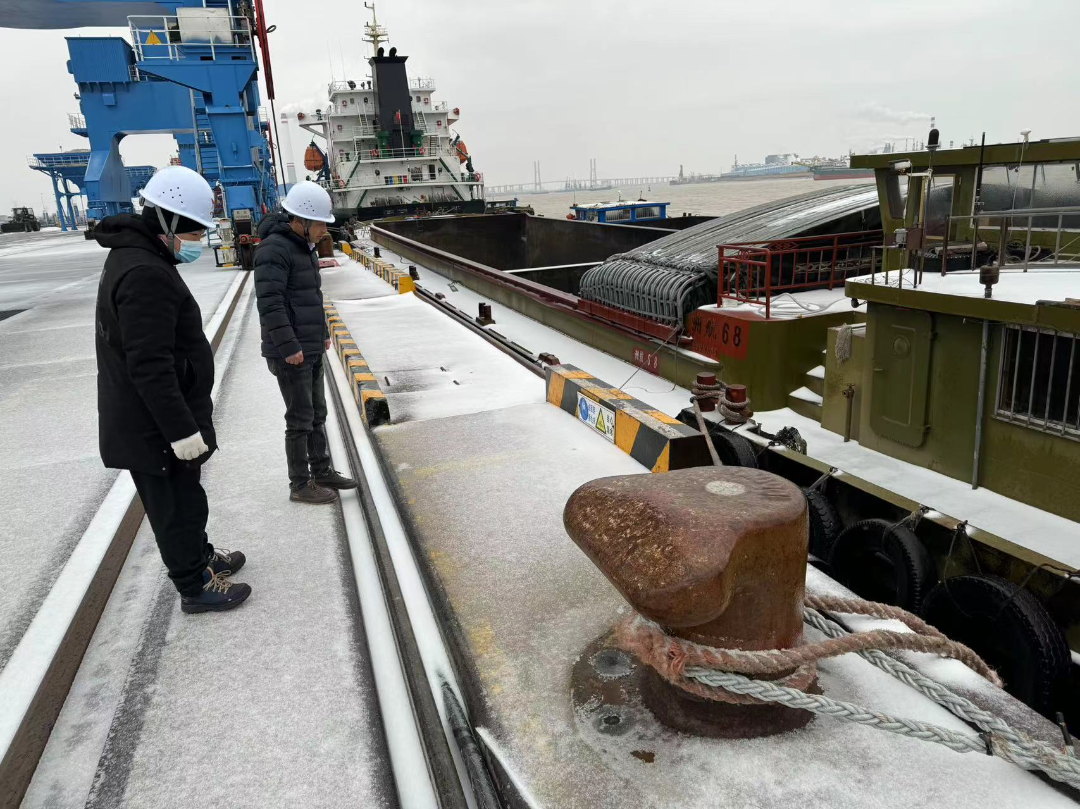 响水港区启动气象灾害 (道路结冰、寒潮、暴雪)应急响应,对靠泊码头的船舶、设备防风工作作出周密部署和安排。对机械设备防风装置及风速仪等设施进行逐一排查,切实做好大型设备标准防风工作;对靠港船舶检查防滑网、扶手绳等,并要求全部船舶按照规范要求系泊缆绳;对变电所、箱变、输电线路等设施进行了统一检查,排除用电安全隐患,全方位保障生产安全稳定。