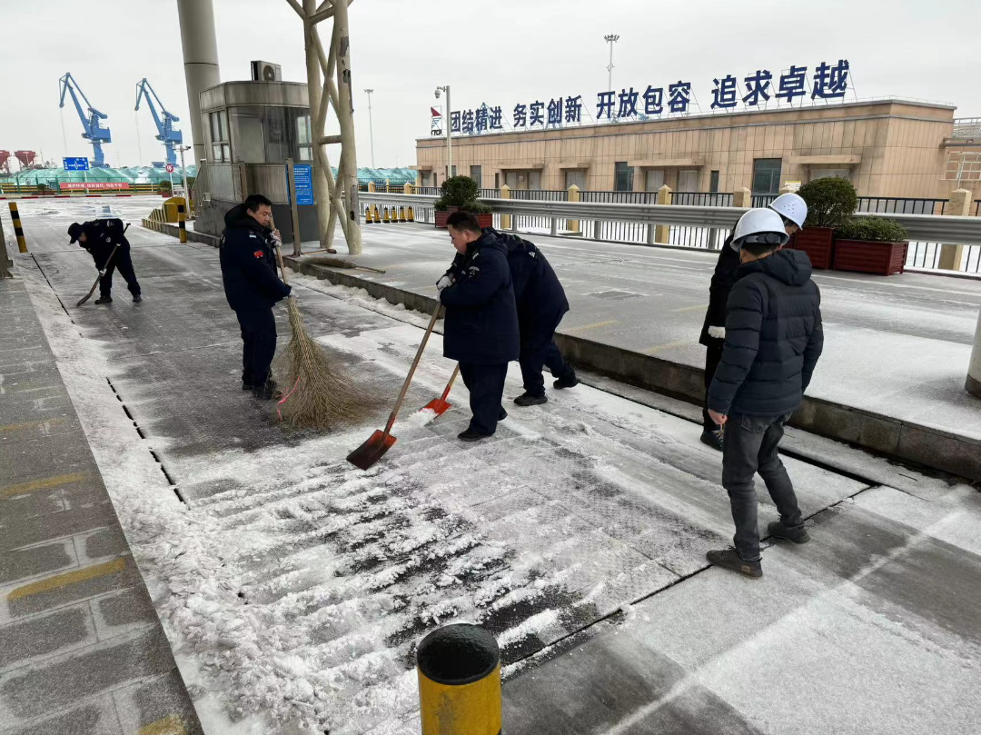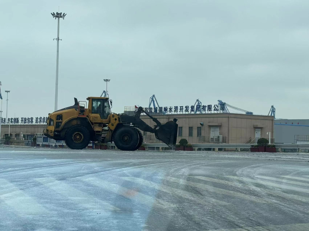 为排除现场积雪,防止道路结冰带来的安全隐患,响水港区采取“机械+人工”协同作业模式,对港区重点区域、主要道路和交通要道等进行清扫,同时根据道路积雪情况,适时组织抛撒融雪剂,全力以赴保障港区道路畅通及职工出行安全。
