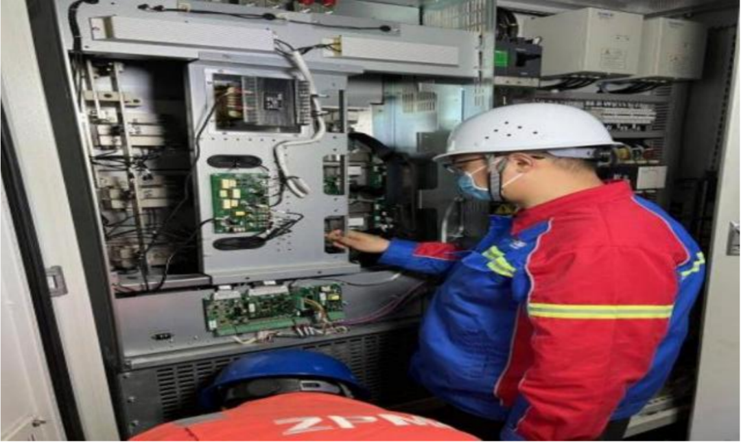 2023年5月,移机准备为两条船只靠泊时,疑似一台门机变频器故障,控制合无法启动。码头作业人员对接售后单位,通过电话指导排查故障源点时却迟迟找不到根源,漫长的等待时刻影响着码头的正常作业进程。信息反馈至设备管理中心,“吉祥”班组经过现场排查很快找到“病因”,12分钟成功解决变频器的故障,使之正常运转。
