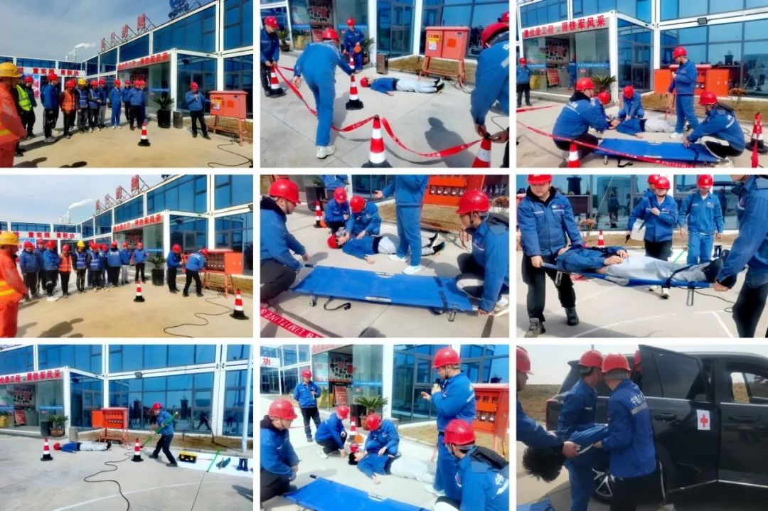 此次演练是针对现场工人作业时突发触电情况进行的模拟。演练内容为事故发生、发现伤员、脱离带电体、情况汇报、预案启动、伤员急救、人员转运等,并安排专职电工讲解防触电及触电后急救知识。