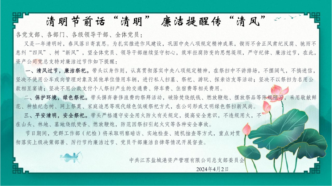 为进一步深化全面从严治党和党风廉政建设工作,深入推进廉政教育,教育引导全体干部职工严守纪律红线、筑牢廉洁底线,资产公司党总支坚持“教育在先、警示在先、预防在先”原则,多措并举、系统施策,打出“教育促廉、承诺悟廉、安全践廉”等组合拳,坚定不移纠治“四风”,推动节日风气持续向好。