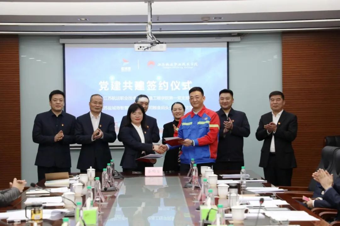 活动分为主题党日活动和现场观摩两个阶段。主题党日活动上,盐城港智慧港口有限公司粮食码头分公司党支部书记和江苏航运学院交通工程学院第一党支部书记上台签订党建共建协议,决定就组织共建、人才共育、发展共促、资源共享建立长期、稳定的协作关系,标志着双方结对成功,正式确立为党建共建单位。随后,校企双方围绕党建共建、人才培养、实习就业、产教融合等方面展开进一步交流,并针对校企资源优势双向赋能进行探讨,以期拓展中长期战略合作新模式,形成常态化、规范化、精准化共建体系。会议结束后,与会人员参观了江苏盐城港智慧港口有限公司粮食码头分公司集装箱码头和党建阵地。
