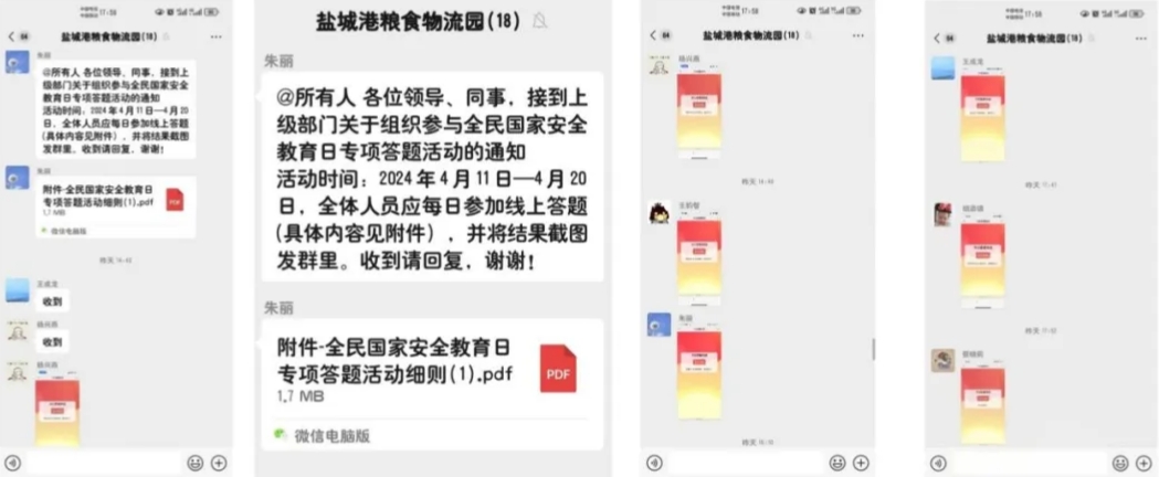线上利用公司微信群、党员学习微信群发送学习资料,全方位、多角度宣传国家安全知识,进一步增强“国家安全无小事”的观念和意识。