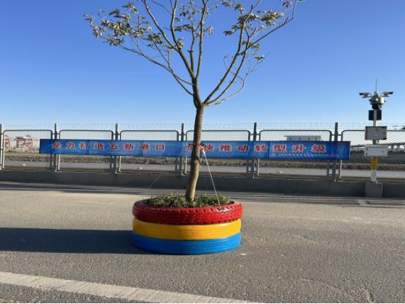 针对地磅站台位置地处码头边缘的现状,为有效防止车辆在运输或掉头拐弯过程中,误闯码头或误滑海域等安全隐患,开展“修旧利废”行动,误闯码头或误滑海域等安全隐患,践行“修旧利废”行动,利用2套支座、4根Φ40的废旧钢丝绳,支座选用预埋定位螺栓,高标号水泥浇筑固定,制作一套安全防护车挡;利用废旧轮胎循环制作路边安全警示“盆景”;聚焦修旧利废“小举措” 实现提质增效“大提升”。
