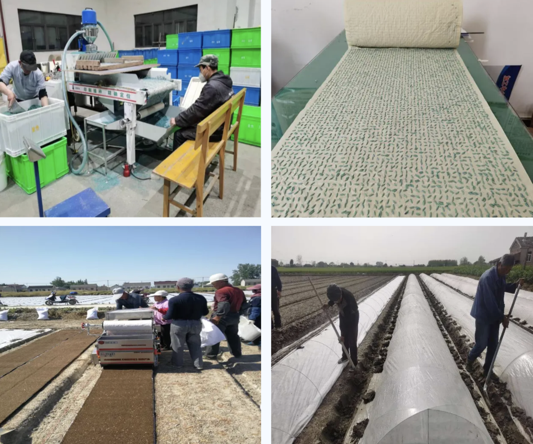 “印刷”现场,两台水稻精准印刷粘种机正开足马力高速运转,随着滚轮转动,铺放在机器上的特殊可降解纸被均匀涂上食用胶,漏斗里经过包衣处理的精选稻种通过定位输送,一粒粒整齐排布在育秧纸上,行列有序,形成一张张长达10余米的“稻谷长卷”,一套流程下来,稻种就像文字印刷一样被印在纸上。“印刷”完毕,就是播种育秧环节。刚“印刷”完成的稻种通过自走式播种一体机进行播种,铺盘、填土、铺粘种纸带、盖基质等作业工序一气呵成,全程省工又省力。播种完成后,工作人员及时加盖好无纺布,做好秧田管理工作,27至45天后,就能“出落”成长势喜人的水稻秧苗。