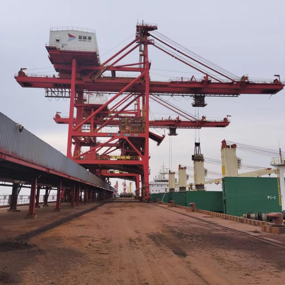桥式抓斗卸船机简称卸船机,是目前专业化散货码头最常见的也是效率最高的装卸船设备,桥式抓斗卸船机可在轨道上运行,门架下净空高度可通运输车辆,抓斗由船上抓散煤后,卸至锥形料斗。通过料斗出料口送至码头上的皮带输送机,然后送至堆场,目前大丰港拥有4台全流程卸船机。
