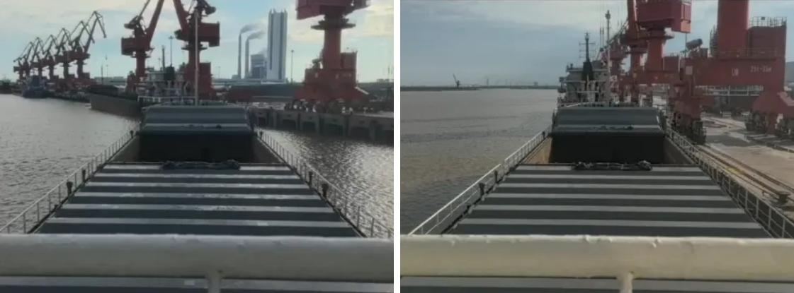 为确保船舶能够在无拖轮的情况下安全靠港,引航员在充分结合码头的生产调度现状的基础上,根据引航手持设备,直观水文条件与航道情况,为避免低平潮浅水效应,根据船舶特性,利用风流压与车、舵、锚、缆相结合,采用抛锚拉大角度船头靠泊的方式进港,在引航员精湛的技艺之下,船尾与泊位周边浮筒擦肩而过,完美地进入码头范围。在主控室中,不断下达车速与舵角的操作指令,在湍急的岸边水流中不断拉扯船舶与码头的位置,最终在码头工人拉紧最后一根缆绳的同时完成本次靠港任务。