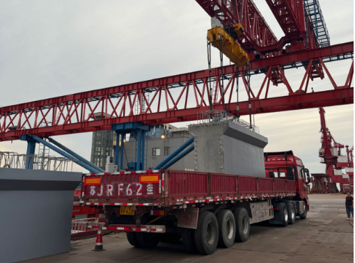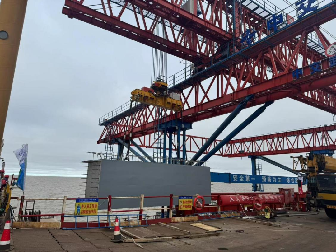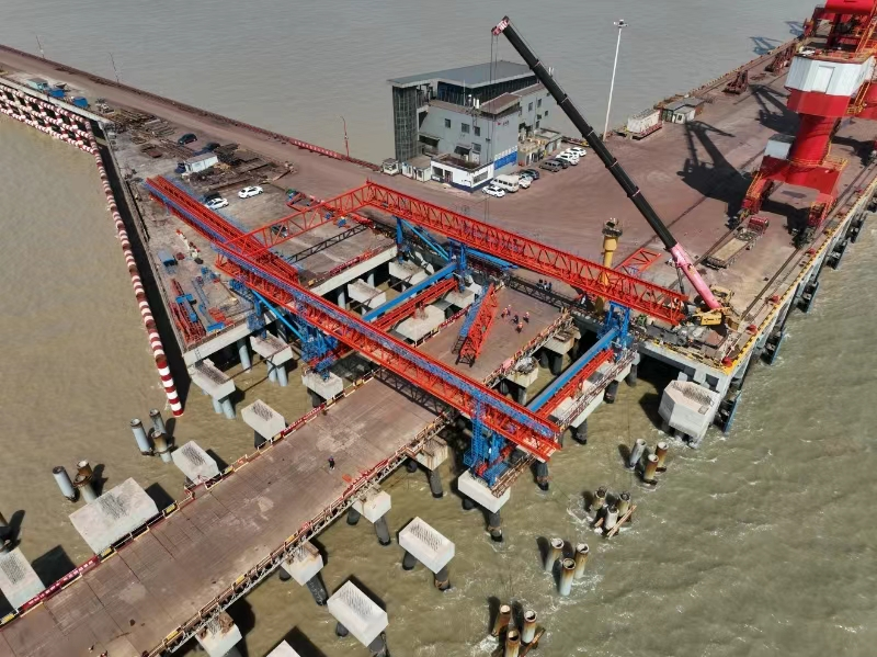 研发和升级新型码头施工装备——一体化智能提梁机,通过横移与纵移机构实现天车在横纵梁范围内的全方位行走,从而进行吊梁作业。与传统浮吊相比,每榀梁安装时间从2小时缩减至15分钟,把“水上施工”转换到“陆地施工”,消除了海浪对施工造成的影响,有效提升施工质量。