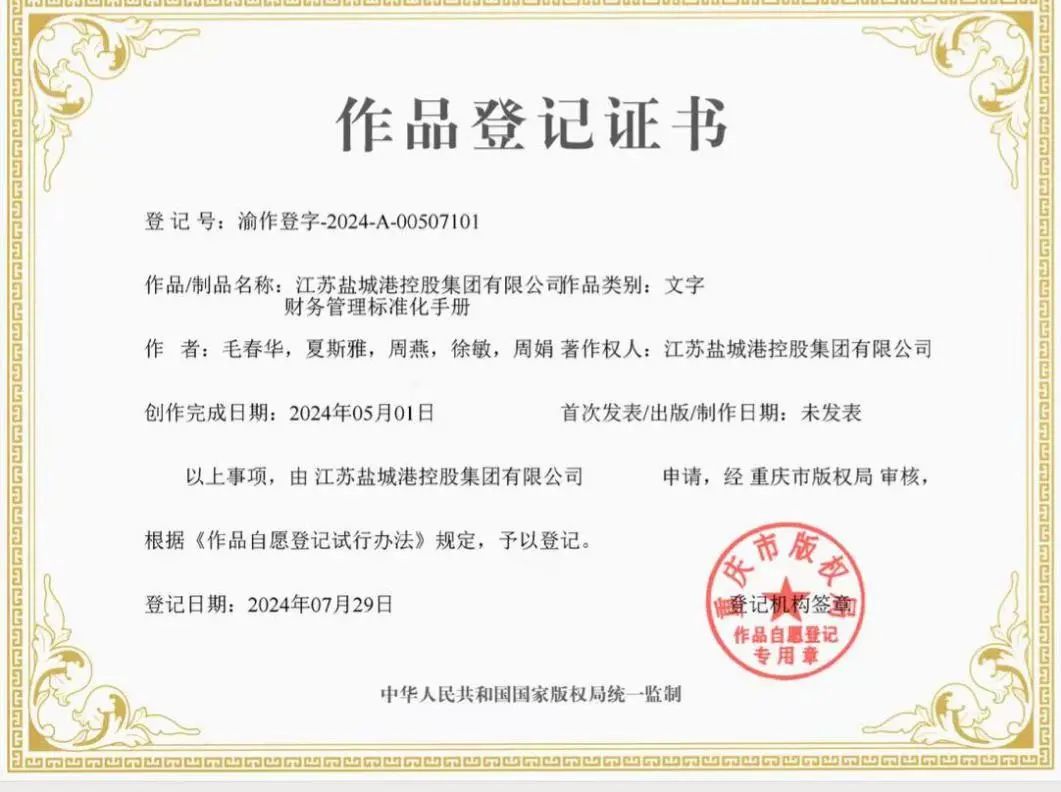 近日,德信体育 自主编制的《财务管理标准化手册》经过严格审核与认证,成功取得了由国家版权局颁发的作品登记证书。这不仅是集团在财务精细化管理方面的积极探索,也是集团对财务管理标准化的创新实践。