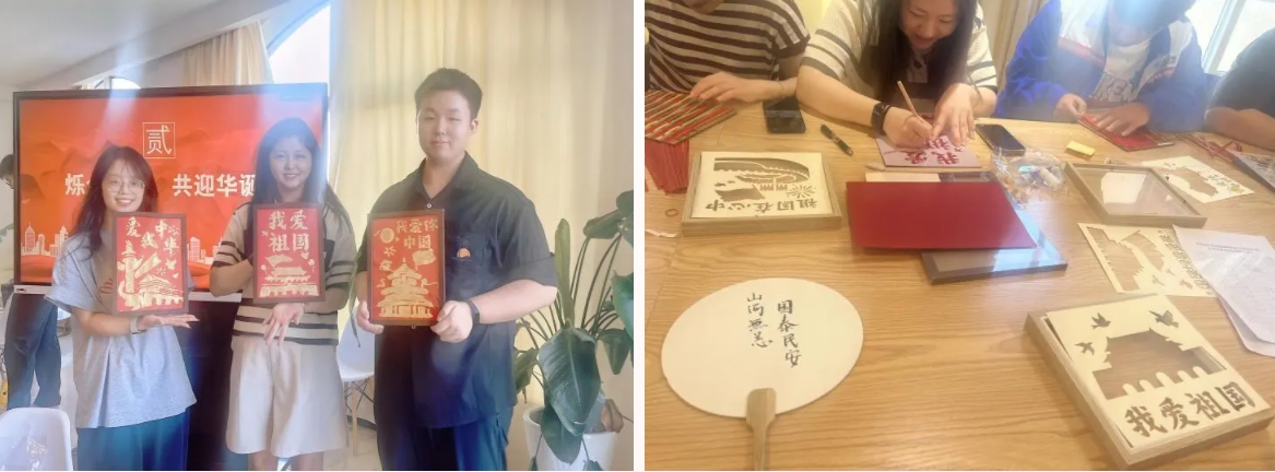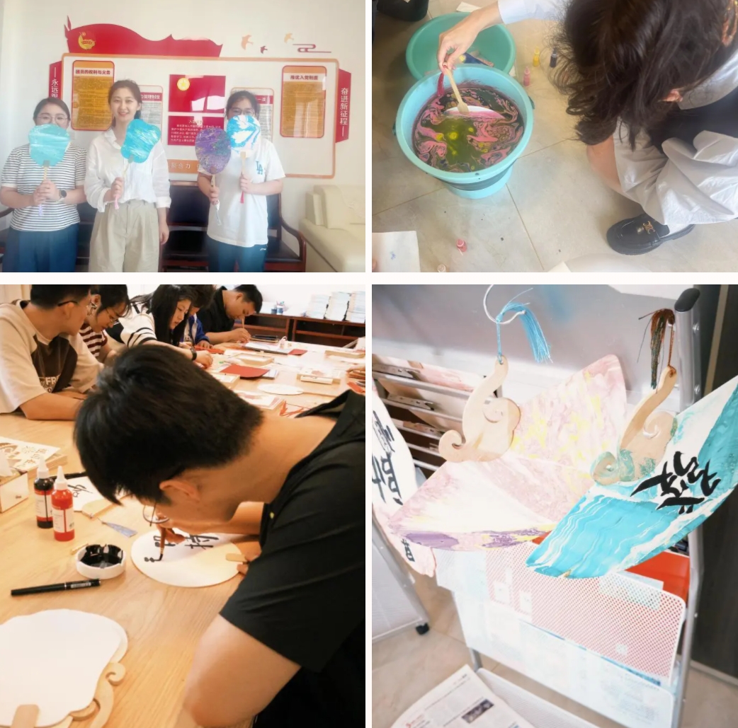 为青年们讲述了漆扇的悠久历史与在华夏艺术殿堂中璀璨夺目的地位,示范了漆扇制作那繁复而精妙的步骤,从选材到上漆,每一步都透露着对美的极致追求。活动中,青年们充分发挥创意与想象,将精心调配的颜料缓缓滴入清澈的水中,随后以轻盈的手法搅动水面,颜料在水中缓缓扩散,形成一幅幅流动的画卷,或清新淡雅,或浓墨重彩,那流云般变幻莫测的纹理,是自然与艺术的完美邂逅,更是青年们传达着对祖国的爱意。