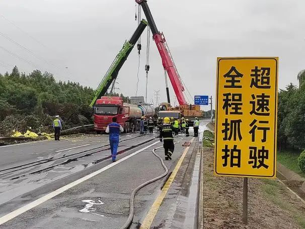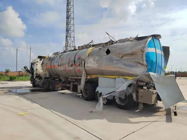 根据现场险情,公安交警部门第一时间封锁事故现场,禁止一切车辆靠近,消防大队出动消防车对事故车辆罐体进行喷射冷却,联系吊车对其进行罐体扶正工作,随后由危化品运输公司救援抢险队使用相关设备将泄漏罐车内的“高沸点芳烃”进行抽取,并转移至指定安全区域。