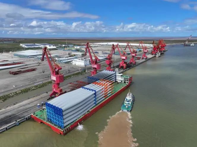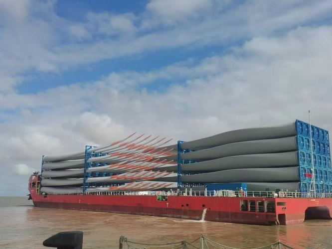 在新时代“盐城港铁军淮海战役”市场开拓大会战期间,忽闻“远景能源印度项目”有成套叶片出口计划,盐城港射阳港区风电公司揽货组在得知此消息后,立即奔赴远景能源物流部、船代、船东、货代等单位,登门宣传射阳港口岸开放情况,最终达成合作。港区也在突破“外贸风电”新货种的同时,实现了“单船作业风电叶片数量最多”“作业效率时间最短”两项之最。截至当前,实现外贸风电吞吐量12.15万吨。
