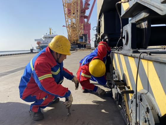 为确保设备防寒工作得到有效落实,射阳港区坚持问题导向,明确责任分工,加大检查监督力度,开展安全警示教育及作业标准方面的专题培训,引导干部职工深入识别和分析各类安全风险,坚持“边检查、边整改、边提升”的原则,重点关注门机、场地机械等关键设备,加强数据监测、设备基础检查力度,准确掌握设备变化情况,打好设备防寒“组合拳”。
