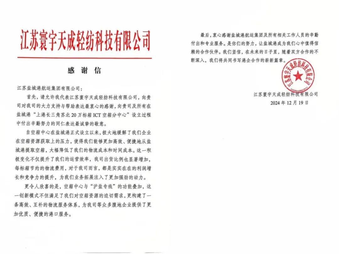 近日,盐城港航运集团收到江苏寰宇天成轻纺科技有限公司一封饱含浓浓谢意的信笺,信中字字深情,句句滚烫,高度赞扬了盐城港为“上港长三角苏北20万标箱ICT空箱分中心”的设立启用所付出的努力,并对盐城港航运集团主动作为、精诚服务、共赢发展的合作精神表示衷心感谢。