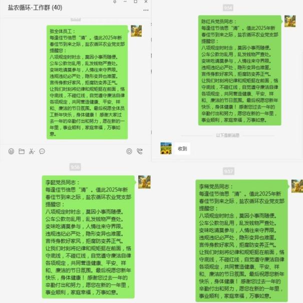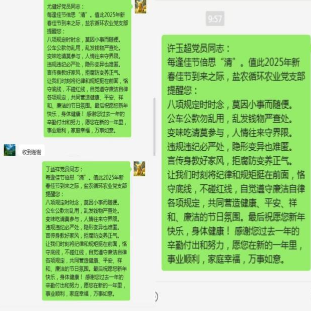 盐农循环农业坚持早研究、早部署、早警示,以节前“廉”动为抓手,持续营造风清气正的节日氛围,节前发送廉洁提醒短信,将警示提醒融入温馨祝福之中引导全体党员干部、群众把好“廉洁关”绷紧“廉洁弦”。