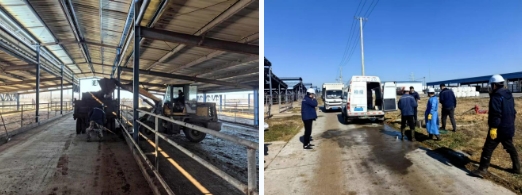 棚舍内,装载机往来穿梭,轰鸣声不断。工作人员加班加点清理牛粪并运往粪污处理区,对牛棚进行全面清扫。身着防护服的消毒人员,手持专业消杀设备,对场地、棚舍、通道以及各类设备进行全方位消毒,为种牛营造一个安全、卫生的环境。