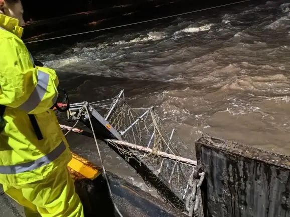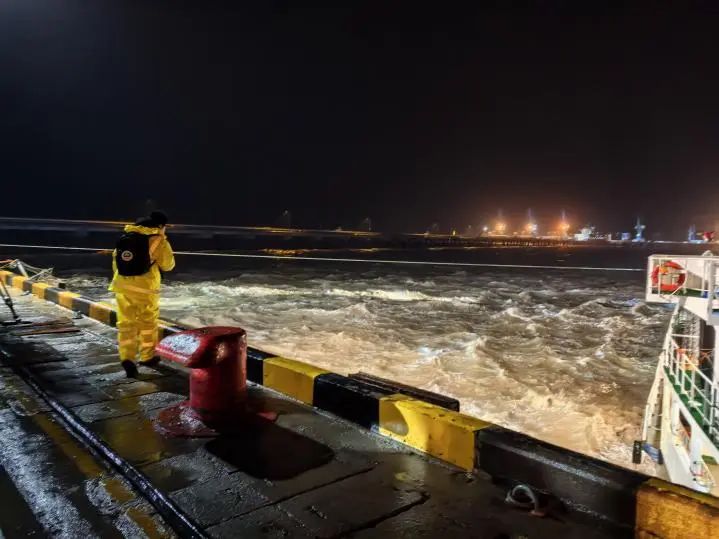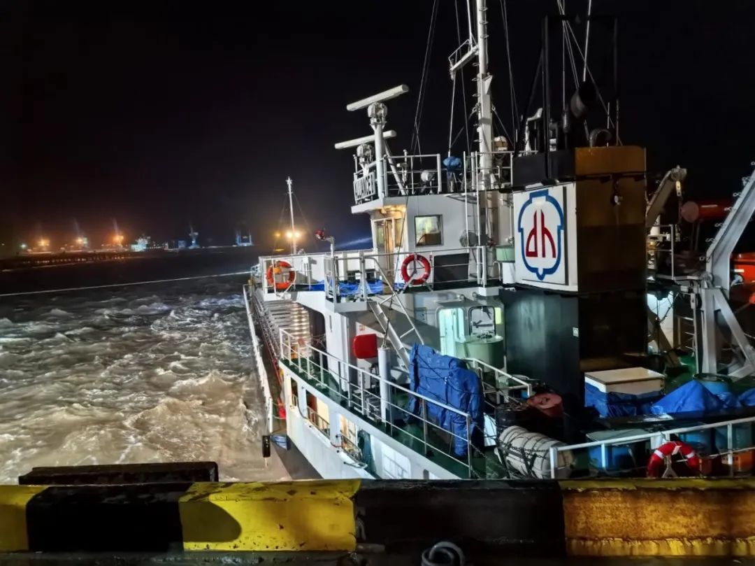 当晚正值农历大潮汛,东北风6级、涌浪2米的恶劣海况给救援带来严峻挑战。引航员抵达现场时,“联盟8”轮船头仅剩1根倒缆受力,船体与码头形成60°夹角持续后漂,且涌浪过大导致无法登轮指挥。面对险情,引航员在码头前沿与交管中心协同决策,果断采取“解尾缆、控船位”的应急处置方案。