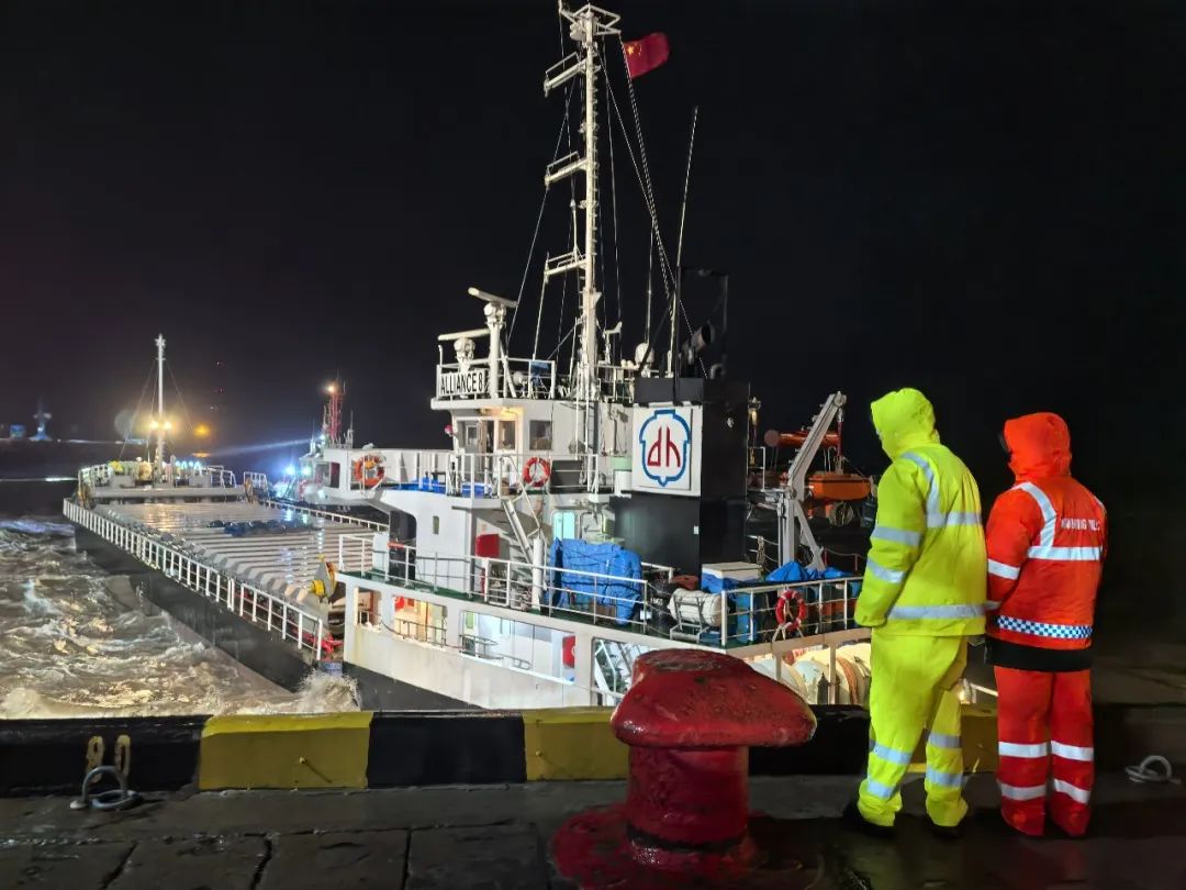 救援过程中突发缆机卡缆故障,引航员立即调派第二艘拖轮“丰港8”增援。通过精准遥控指挥,采取进车抵浪、拖轮顶推等组合措施,有效控制船舶漂移态势。经多部门协同作战,成功助该轮安全驶离泊位,未造成次生事故。