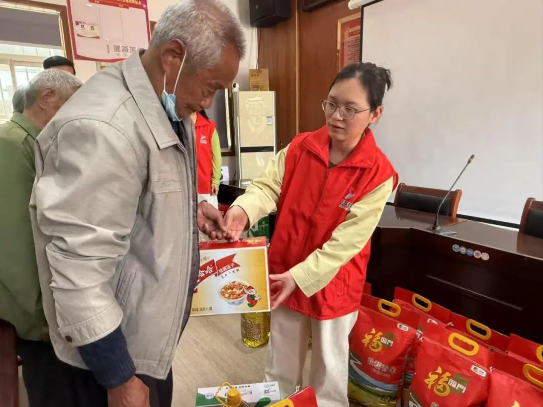 当员工们将大米、食用油、牛奶、保暖用品等生活物资逐一递到老人手中时,现场响起了阵阵掌声。