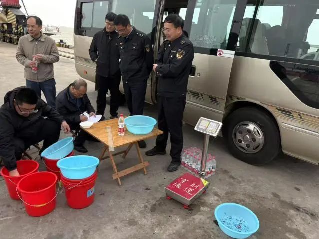 活动当天,射阳港区3.5万吨级码头现场秩序井然,射阳港区志愿者、农业农村局工作人员、技术专家及公证处人员共同参与放流。工作人员严格遵循操作规程,对蟹苗开展质量检验、计数及装运工作。放流前,技术人员对苗种进行严格检验检疫,确保无病虫害、无药物残留,为蟹苗健康成长提供基础保障。当鲜活的蟹苗被缓缓放入海中,“小家伙们”迅速游向深海,现场响起阵阵掌声。