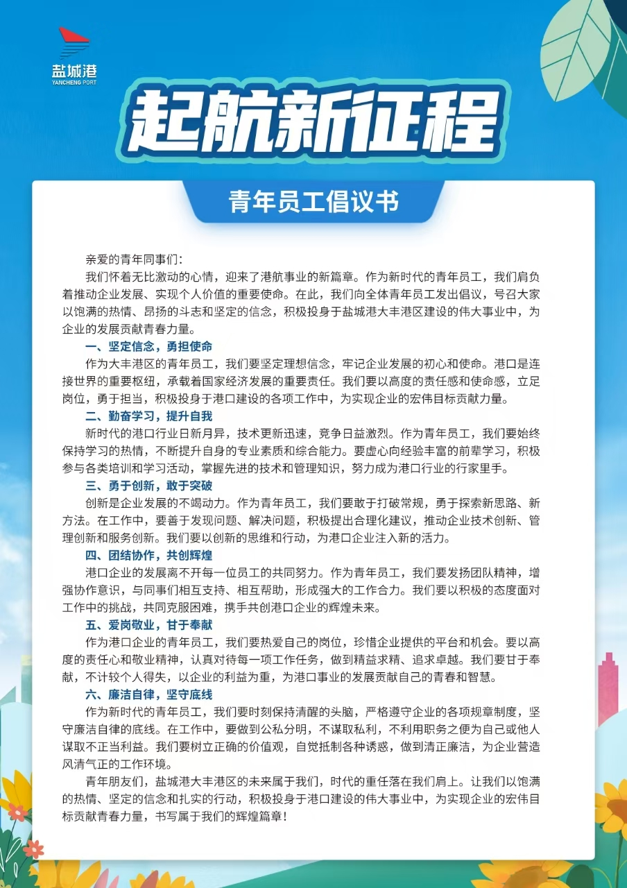 深入机关、码头一线、项目建设现场,发放《起航新征程——青年员工倡议书》200余份,号召广大青年,以饱满的热情、昂扬的斗志和坚定的信念,积极投身于盐城港大丰港区建设的伟大事业中,为亿吨大港建设贡献青春力量。