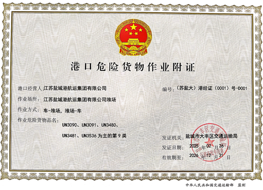 今年以来,为推动港口危险货物集装箱业务开展,在交通、海关、海事、边检、安监、环保等部门的大力支持和指导下,航运集团集装箱堆场分公司科学规划堆场布局、优化运输路线、配置智能化设施、提升业务人员资质、完善应急预案,成功取得“港口经营许可证”“港口危险货物作业附证”双证,成为盐城地区首家且唯一的集装箱危险货物堆场,为全市“新三样”产业提供了一条最为便捷的运输通道。