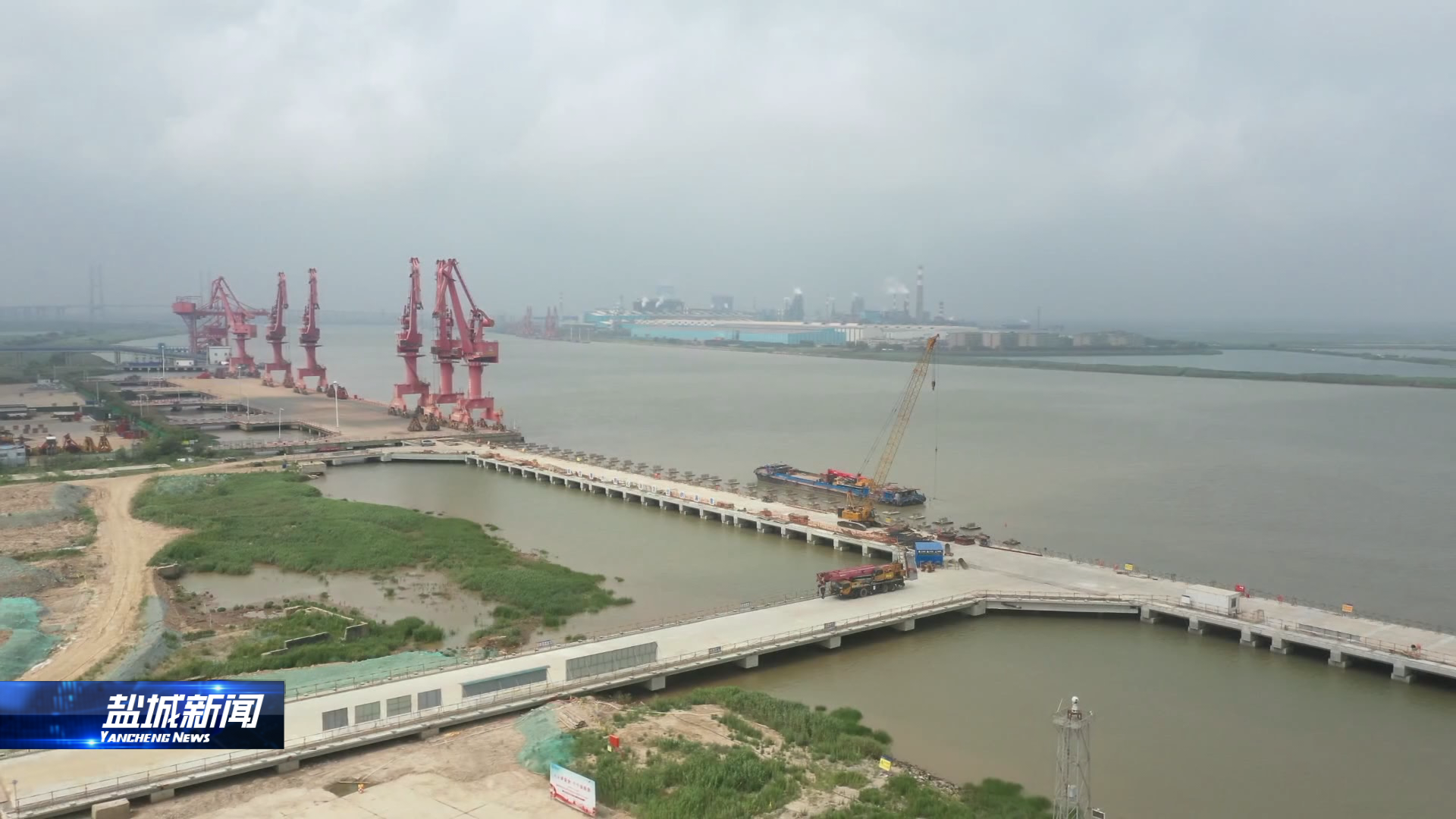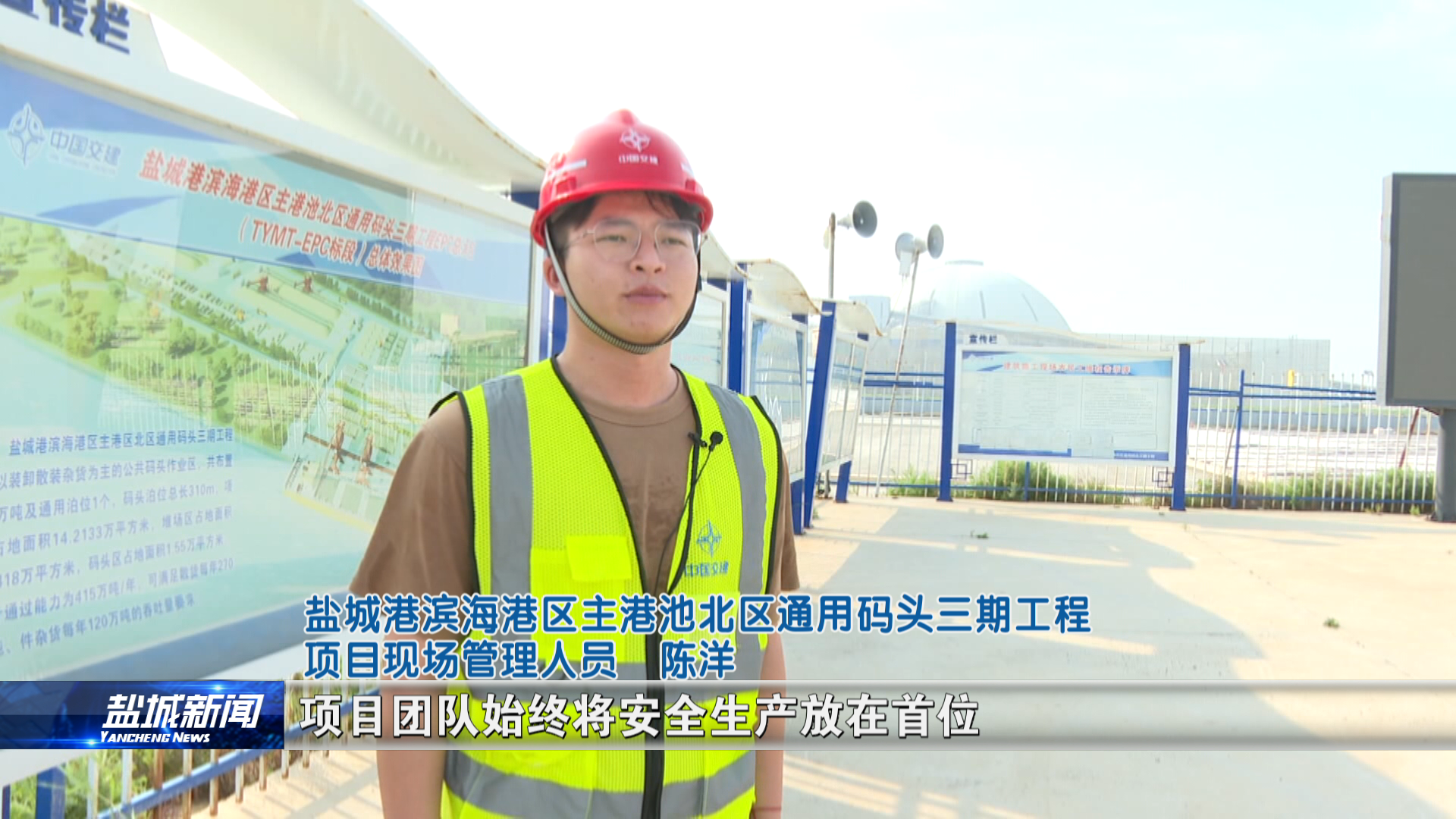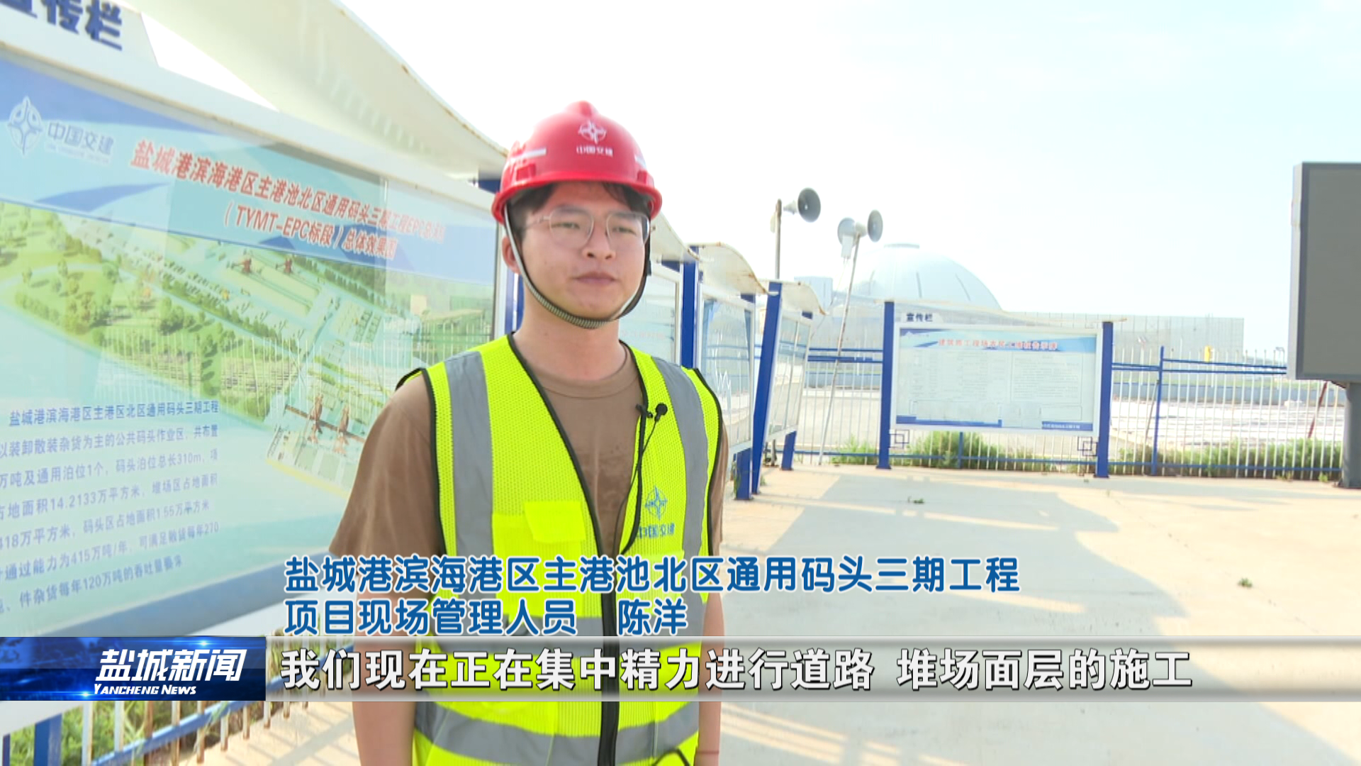 镜头转向盐城港滨海港区主港池北区通用码头三期工程施工现场,航运码头已初具规模。堆场区域工人正安装路缘石,洒水车穿梭养护。据项目负责人介绍,目前项目每天投入30余人及10余台设备,抢抓进度,确保7月按计划进行道路面层施工和港池开挖。