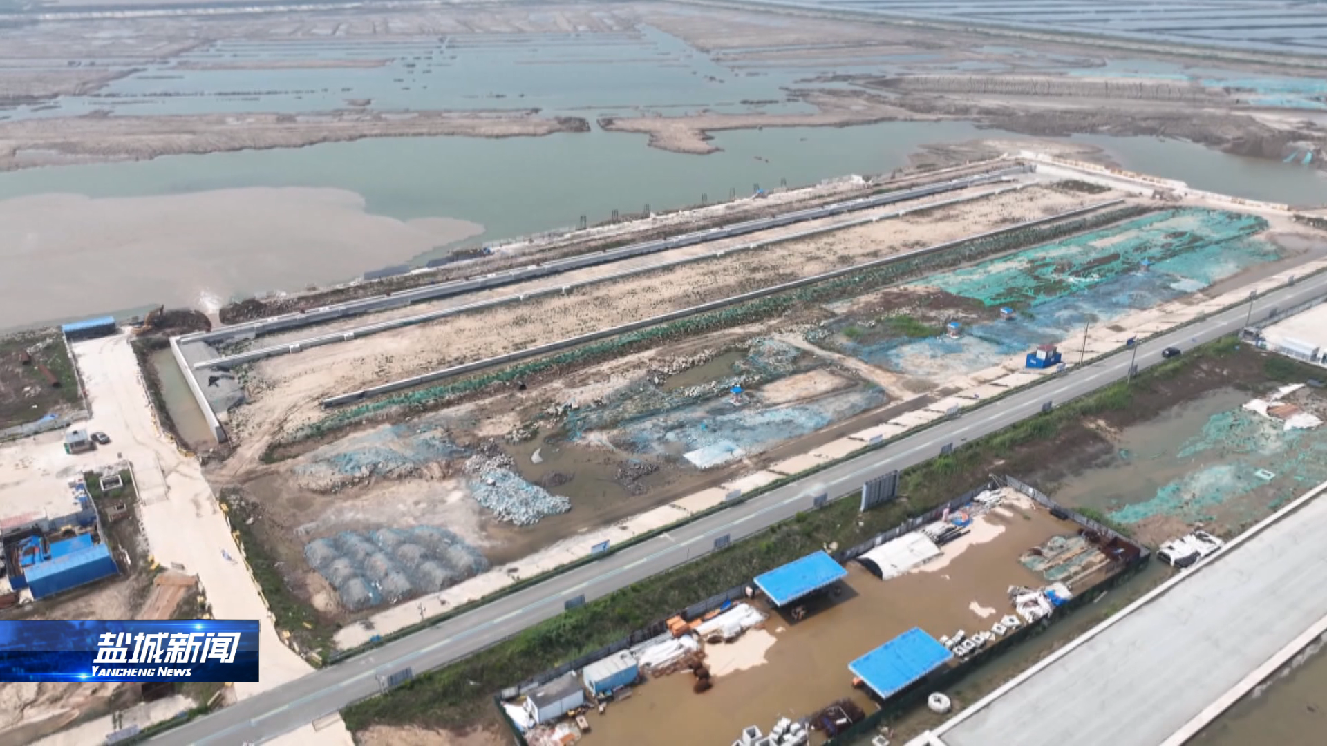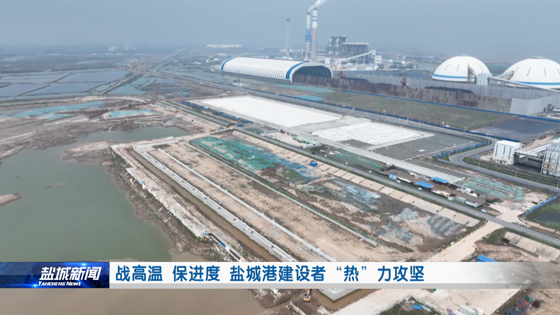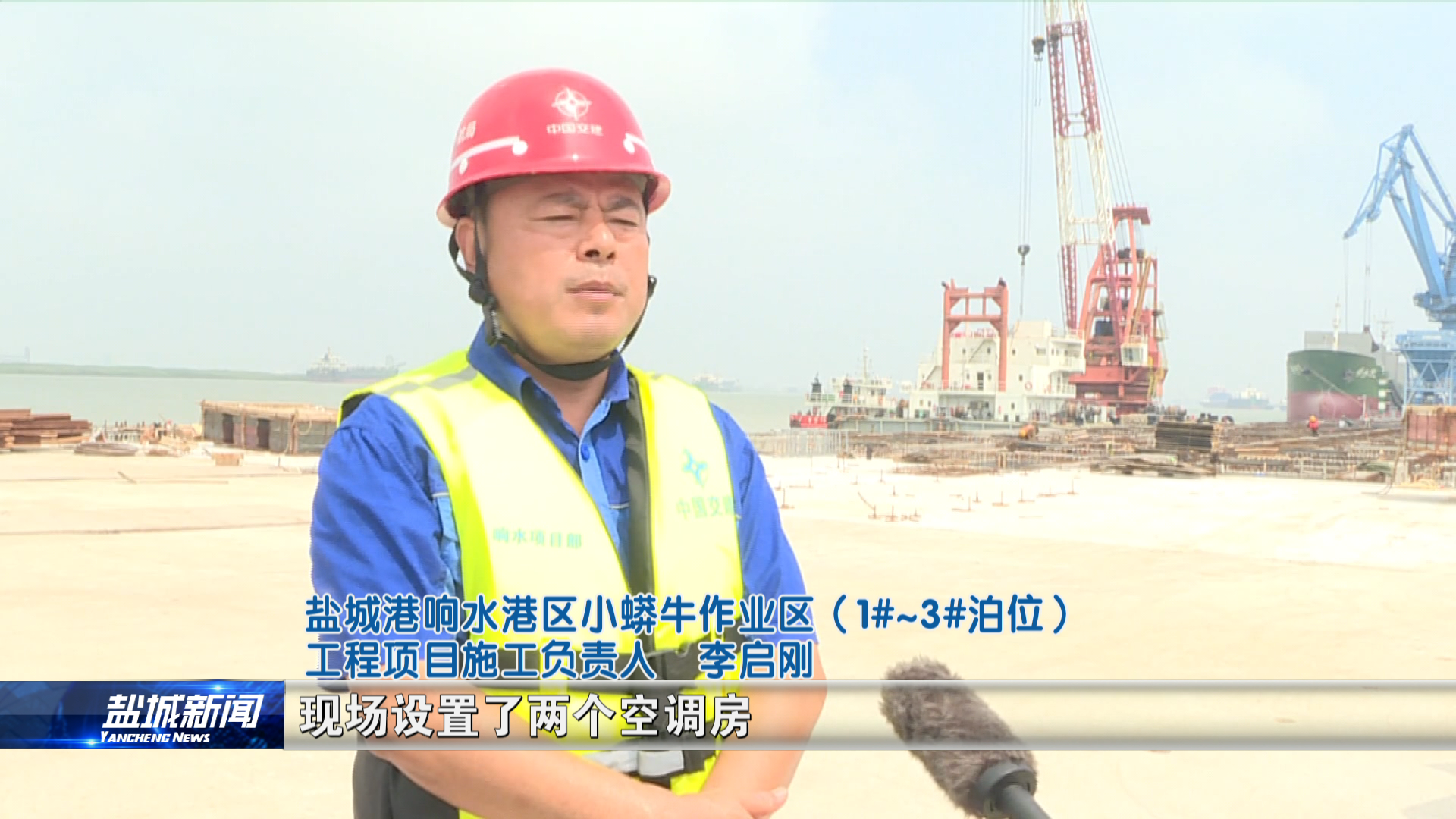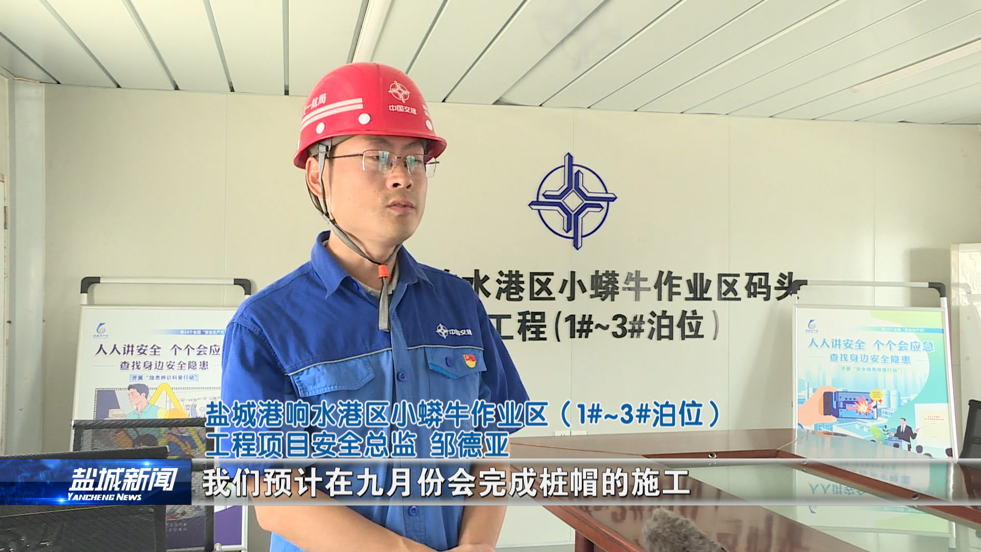 镜头转向盐城港滨海港区主港池北区通用码头三期工程施工现场,航运码头已初具规模。堆场区域工人正安装路缘石,洒水车穿梭养护。据项目负责人介绍,目前项目每天投入30余人及10余台设备,抢抓进度,确保7月按计划进行道路面层施工和港池开挖。