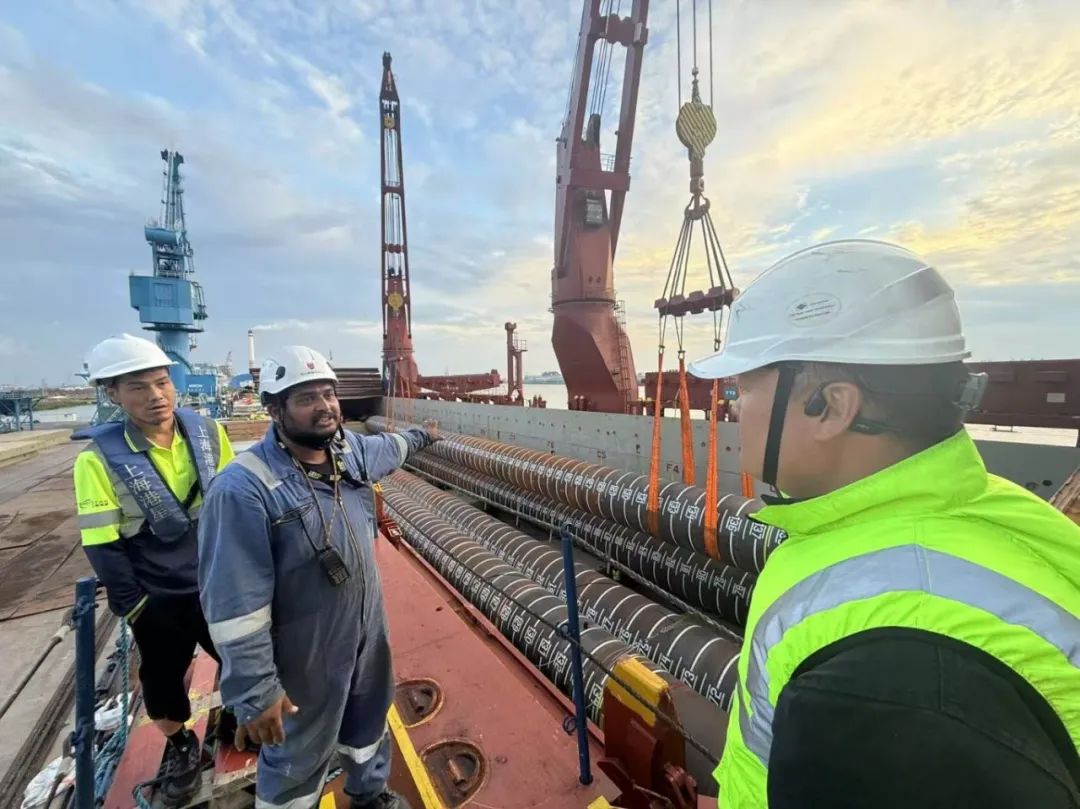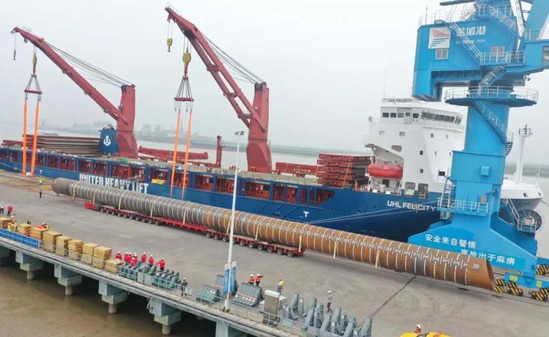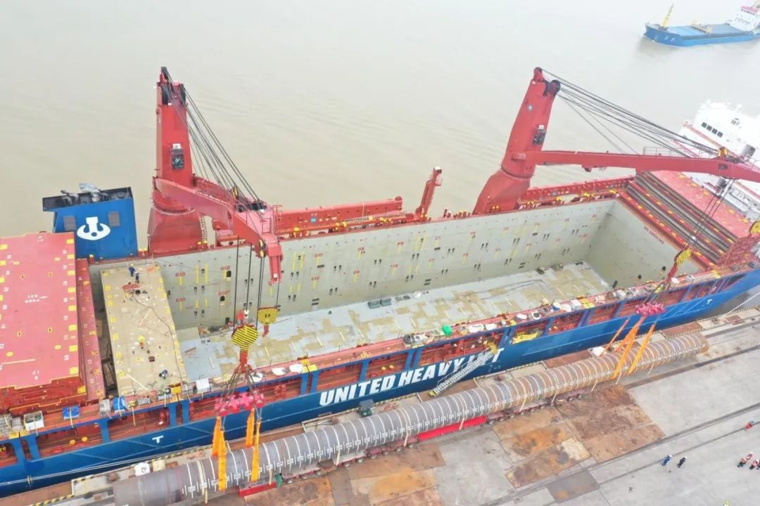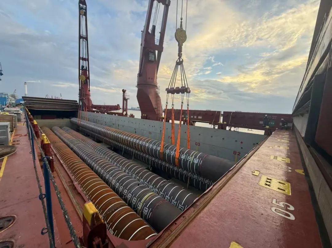 “幸福号”货轮承载着江苏天能海洋重工有限公司精心制造的尖端管桩装备,这些“大国重器”将远赴中东,为当地油气资源开发提供关键基础设施支持。全船共装载45件管桩及配套钢结构,其中管桩长度普遍超过40米,最长达76.8米,单件最大重量突破377吨,堪称“海上钢铁巨龙”。