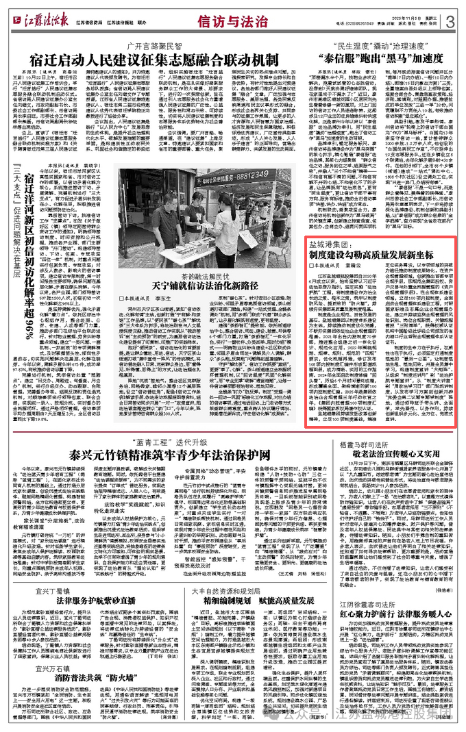 江苏盐城港控股集团自2020年6月成立以来,始终坚持以习近平法治思想为指引,坚定实施“法治护航”工程,将制度建设作为治企长远之策、根本之策,筑牢以制度防风险、提质效的“防火墙”,持续夯实集团高质量发展制度根基。