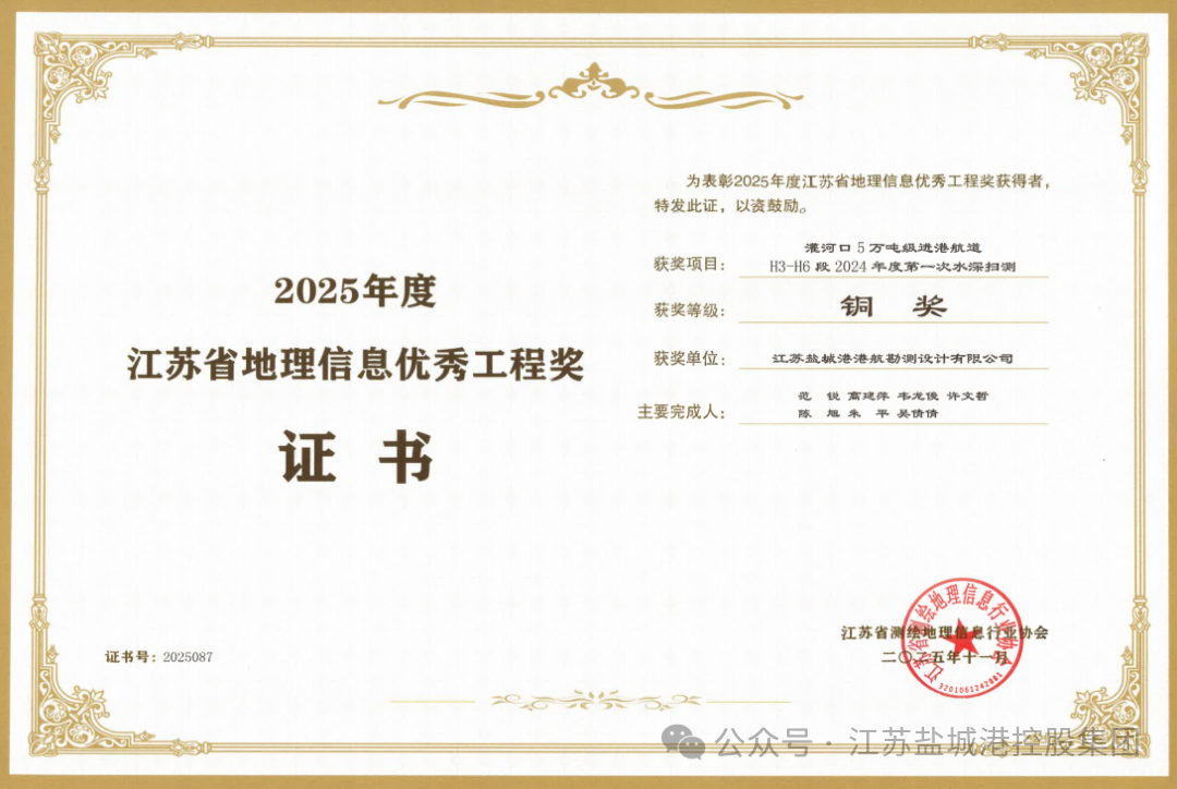 近日,江苏省测绘地理信息行业协会正式公布2025年度江苏省优秀测绘地理信息工程获奖名单,盐城港港航勘测设计有限公司凭借《灌河口5万吨级进港航道(H3-H6)段2024年度第一次水深扫测项目》再次斩获殊荣,成功获评省级优秀工程铜奖,专业实力再获行业权威肯定。