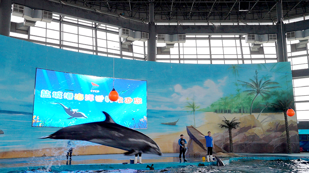在海洋世界里,可爱的海豚在驯养员的指挥下尽情地舞动着,从水中一跃而上而又轻轻落入水中,展现着灵活的身姿。海豚的精彩表演和与观众的亲密互动,赢得游客阵阵喝彩和掌声。