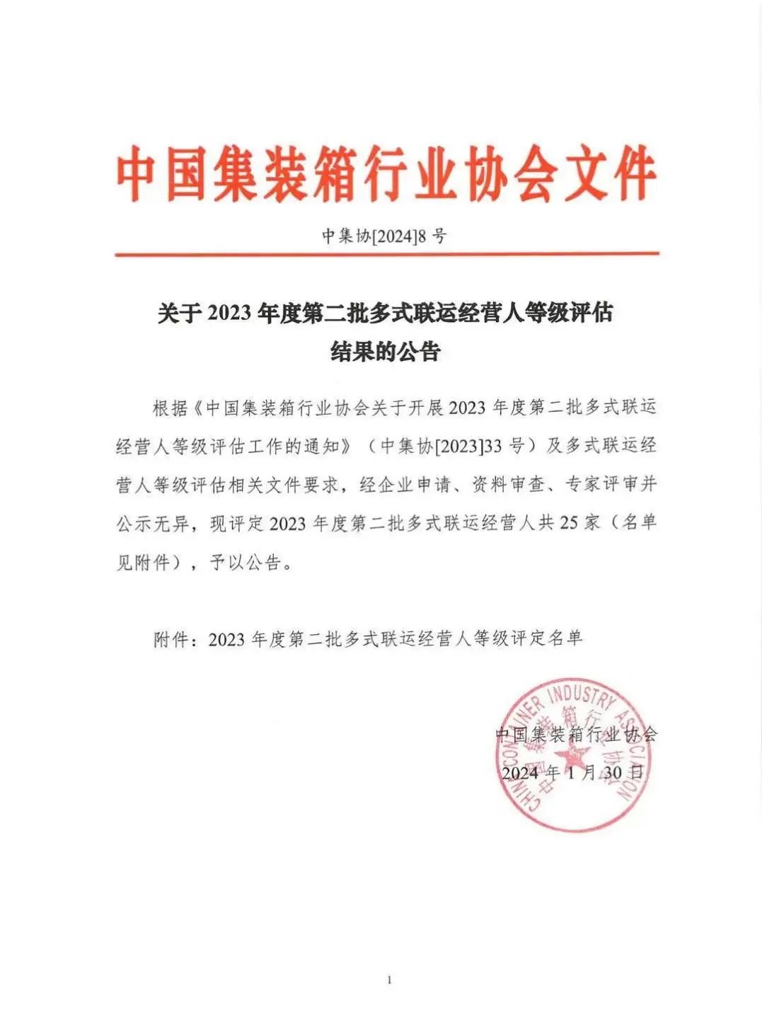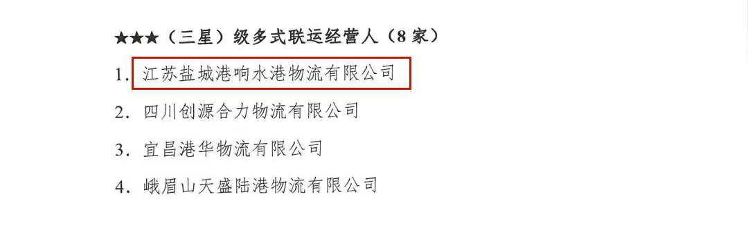 近日,中国集装箱行业协会发布2023年度第二批多式联运经营人等级评定名单,江苏盐城港响水港物流有限公司获得“三星级多式联运经营人”称号。