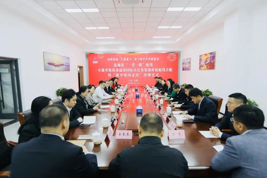 4月21日,盐城港“一带一路”航线—至俄罗斯海参崴港国际直达集装箱班轮航线首航暨“俄罗斯国家馆”授牌仪式成功举行。德信体育 副总经理袁欣,俄罗斯联邦政府经济发展部、农业部俄罗斯出口中心国家馆负责人罗曼诺夫·伊利亚·安德烈维奇,俄罗斯联邦政府自然资源和生态部镍矿出口负责人科里尼卡夫·叶甫盖尼·斯捷巴诺维奇,盐城大丰海事处处长朱龙锦,盐城海关驻大丰港办事处副主任朱天乐,盐城出入境边防检查站边检处副处长张伟,海铁联捷公司海运事业部总监蒯霞、香港公司经理杨森,江苏俄货宝国际物流公司执行董事史素华出席活动。盐城港航运集团、大丰港开发集团、保税物流中心、粮食物流园相关负责同志等参加。