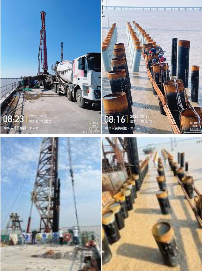 图三、图四:东堤B段第七分段最后一根钢管桩打桩施工。