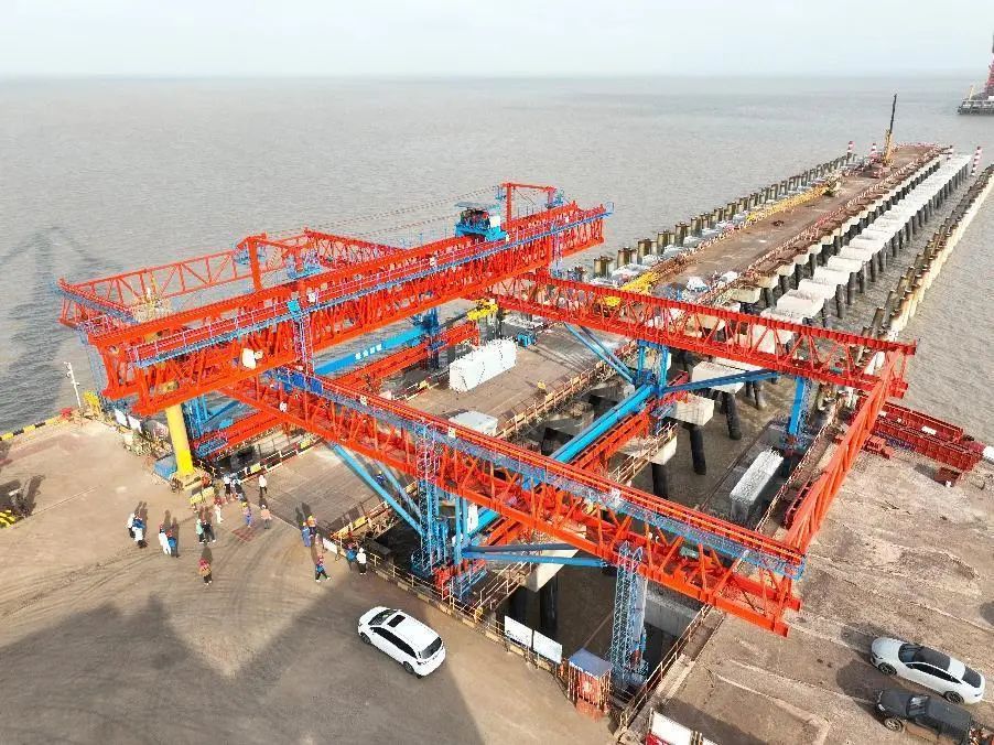 不仅如此,筑港机还进行了智能化改造升级,配备了数字监控平台。在安装下放过程中,通过系统精准掌控构件姿态并自动调位。系统自动识别梁板安装目标位置图像后,将构件快速、平稳、精准落入,实现全过程智能安装。一跨的“积木”拼装完成后,再自动前行、过跨,进行下一跨安装,施工效率和安装精度大幅提升,现场作业人员和设备投入大大减少。