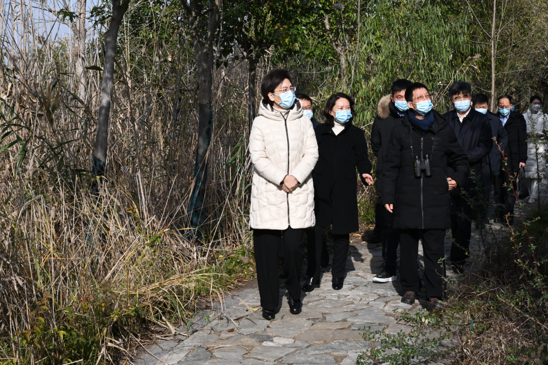 在冬日暖阳的照耀下,大纵湖湖面波光粼粼,成群结队的水鸟或静卧水面、或盘旋飞翔,与开阔的水面构成一幅生机勃勃、旖旎灵动的湿地画卷。徐缨来到大纵湖国家湿地公园,实地调研湿地保护、生态修复、设施建设等情况,听取大纵湖生态岛试验区规划布局、建设进展等情况汇报,并与有关方面深入交流,探讨建设生态岛试验区的有效路径。徐缨说,习近平总书记在党的二十大报告中强调,中国式现代化是人与自然和谐共生的现代化。盐城湿地、森林、海洋三大生态系统交融,保护传承好宝贵的生态家底,树立绿色低碳发展典范是我们应有责任。我们要认真践行习近平生态文明思想,以生态岛试验区建设为重要契机,大力实施生物多样性保护,切实改善生态环境质量,高标准创造优质生态产品,充分展示试点建设成效,放大黄海湿地世遗品牌效应,全面建设人与自然和谐共生的现代化。
