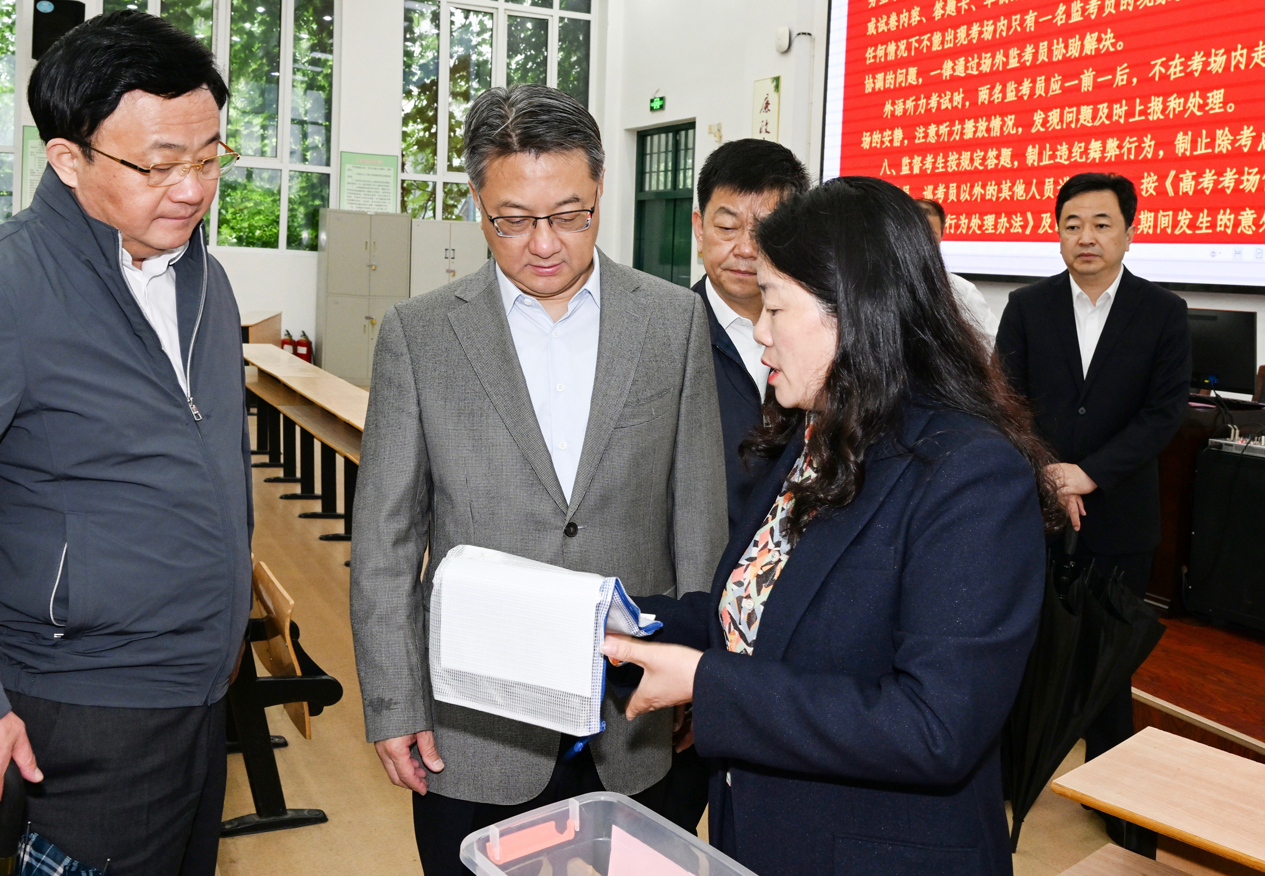 今年全市共设 8 个考区、21 个考点、1249 个考场,各项准备工作已全部就绪。周斌来到亭湖高级中学考点,沿着考生入场线路,认真检查考点准备工作。他在校门口体验智能安检门检测,走进考场仔细察看考生桌椅摆布,肯定学校硬件设施和良好的考试环境。在考点监控室、考务室,周斌检查监控设备运行等情况,了解监考流程规范等,要求对考务、后勤等工作再梳理、再检查,细而又细抓好每个环节,严肃考风考纪,确保高考公平公正,为国家选拔栋梁之才。来到市招生考试中心,周斌详细了解试卷安全保密、运输保障和各考区指挥调度等工作,叮嘱各责任部门单位坚决执行考务工作规定,压紧压实责任链条,完善应急预案,确保高考工作万无一失。