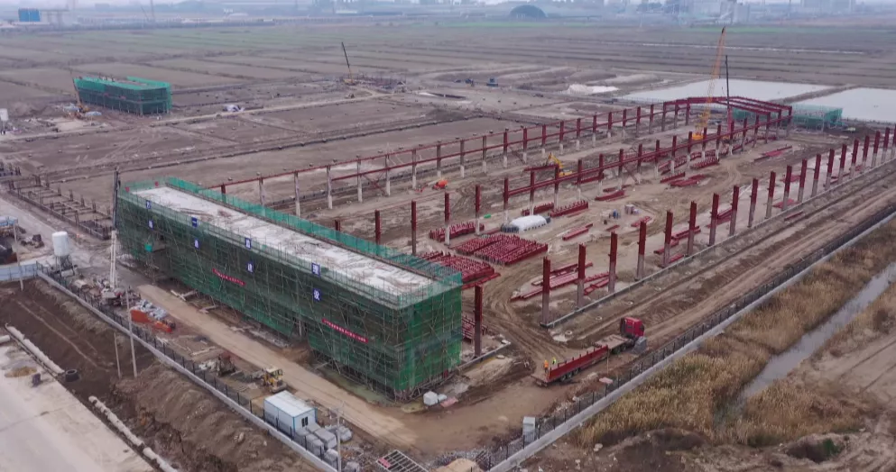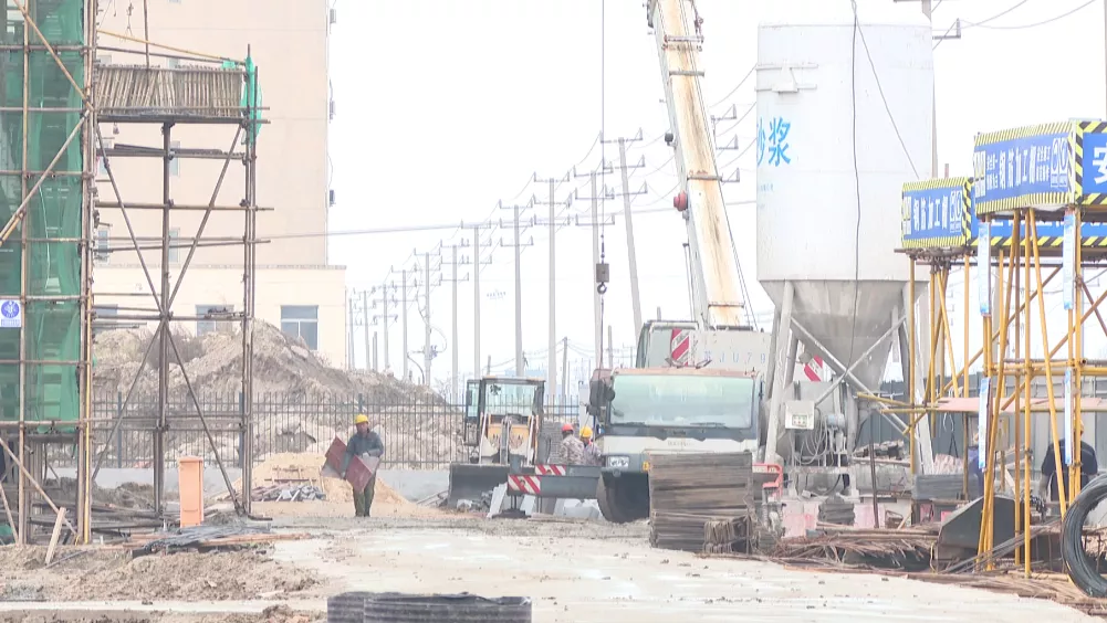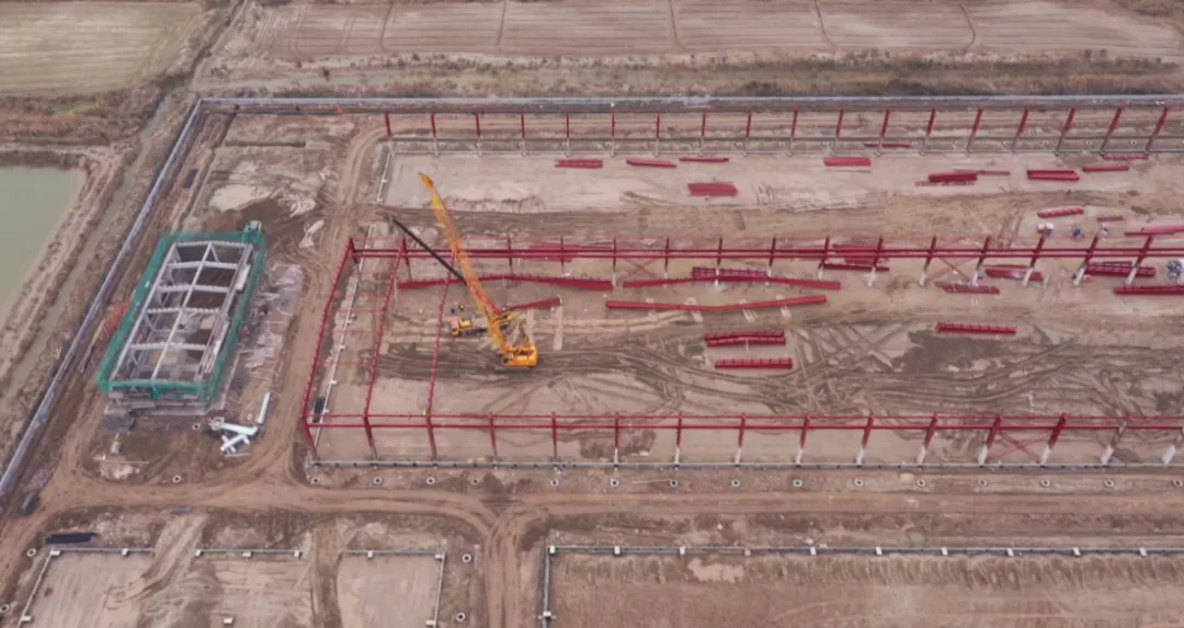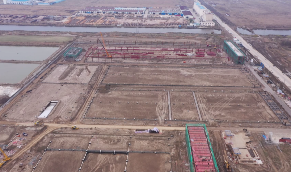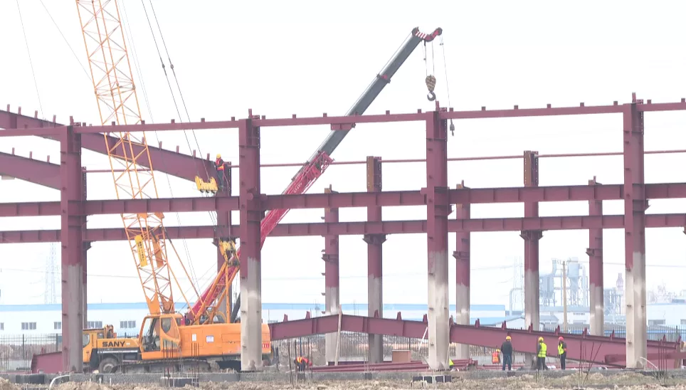 走进大丰港区昆仑绿建项目建设现场,工人们正在紧张作业,钢管架密如织网、轰鸣声震耳欲聋、运输车来回穿梭,现代化的厂房即将拔地而起。