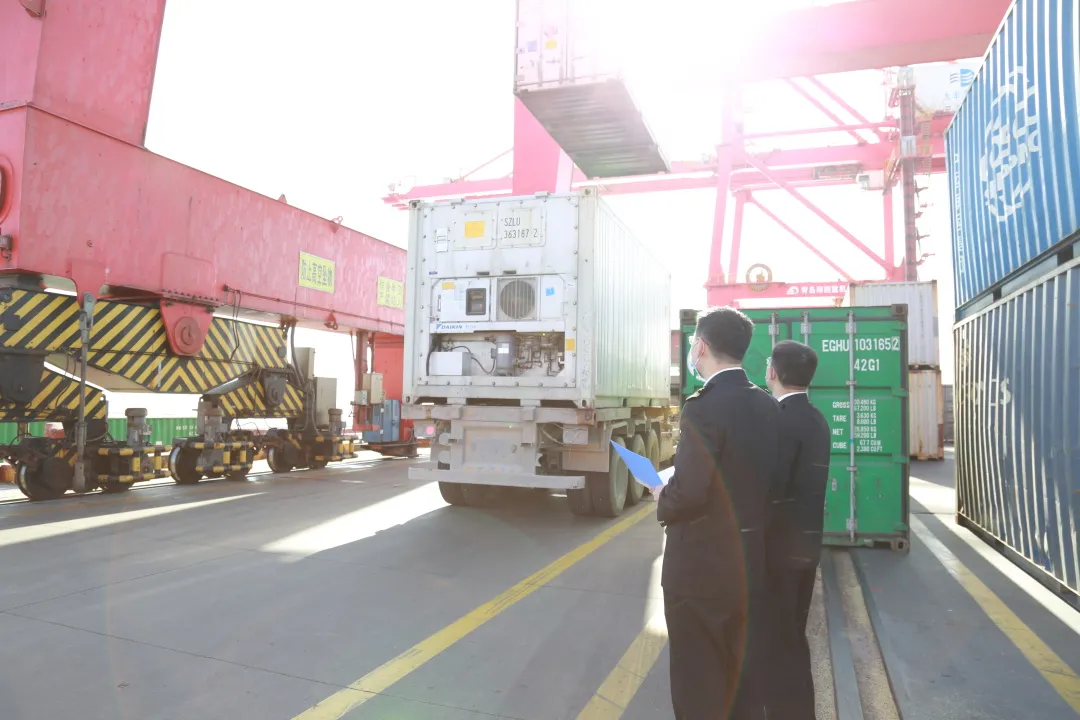 图为:盐城海关关员对“沪丰通”搭载的出口集装箱货物进行监管