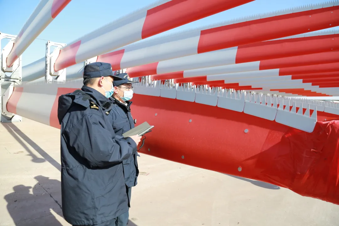 图为:盐城海关关员对“沪丰通”搭载的出口风电叶片进行查验