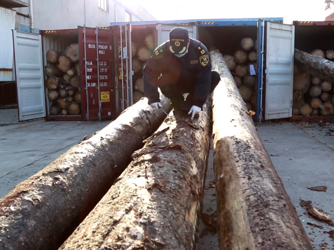 图为:盐城海关关员对“沪丰通”搭载的进口木材进行检疫查验