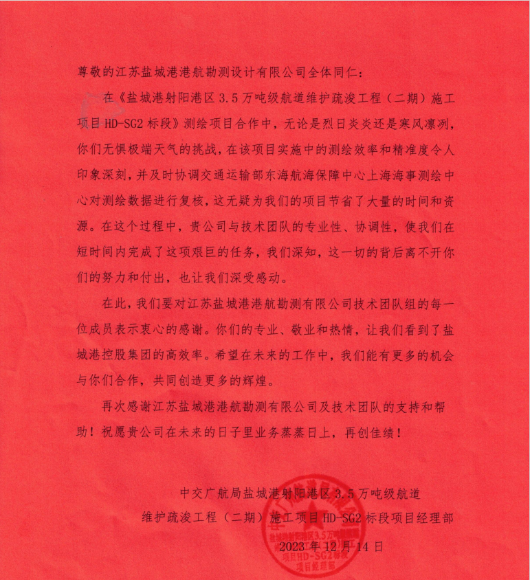 近日,盐城港港航勘测设计公司收到来自中交广航局盐城射阳港区项目经理部的感谢信,感谢港航勘测设计公司及技术团队的支持和帮助。