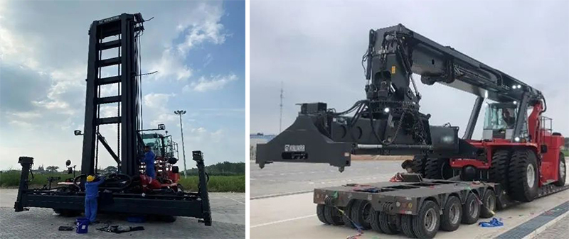 集装箱堆高机和正面起重机广泛用于码头、堆场的集装箱装卸、空箱堆叠、水平运输等,它具有机动灵活、操作方便、稳定性好、轮压较底、堆码层数高等优点。