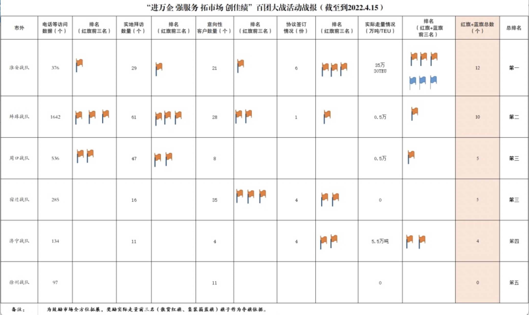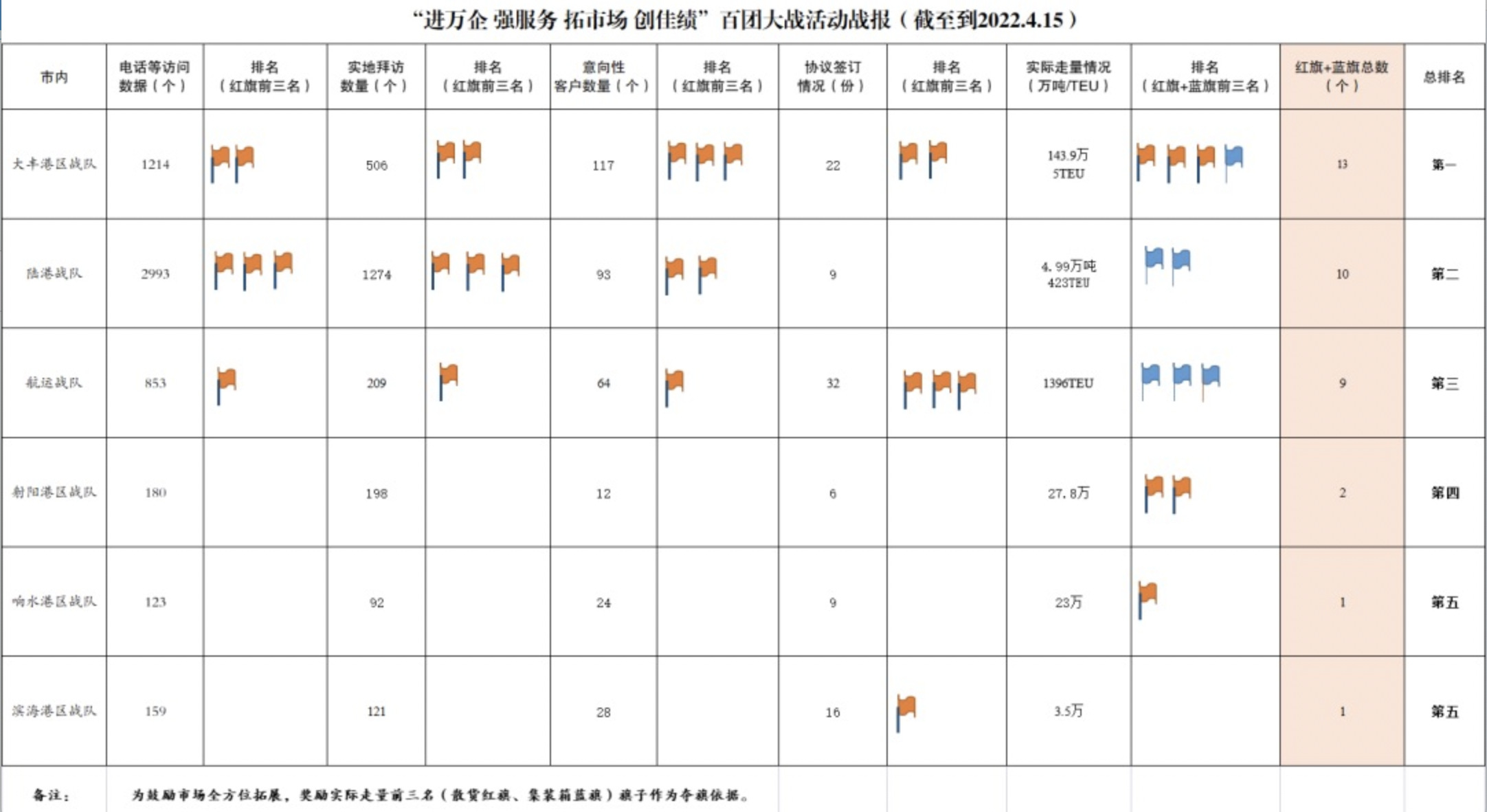 各战队拜访客户11156家,其中实地拜访客户2564家,电话、视频、邮件等方式拜访8592家,其中意向客户445家,协议签订109份(其中云签约19份),实际走量244.69万吨(其中云签约10万吨),集装箱1854TEU(其中云签约153TEU)。
