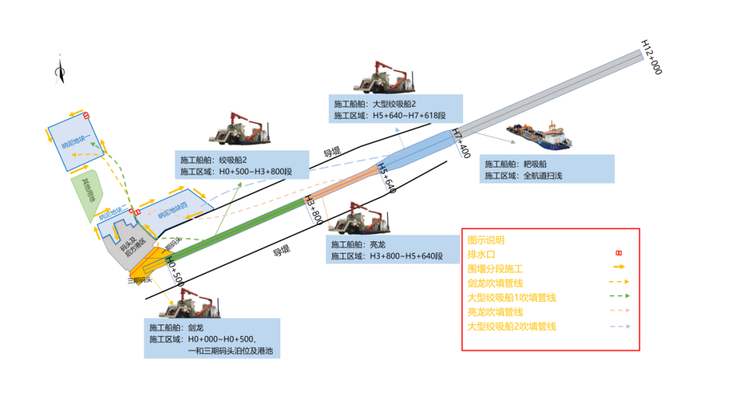 八月飘香季,奋斗正当时。在3.5万吨航道上,机器轰鸣,“普交工1”号、“剑龙”号、“亮龙”号三“舰”合璧,将疏浚航道产生的疏浚土通过管线输送到指定的纳泥区。围堰上,工人们铆足干劲,土工布铺设、袋装土码砌加紧施工……现场一片热火朝天的建设景象。