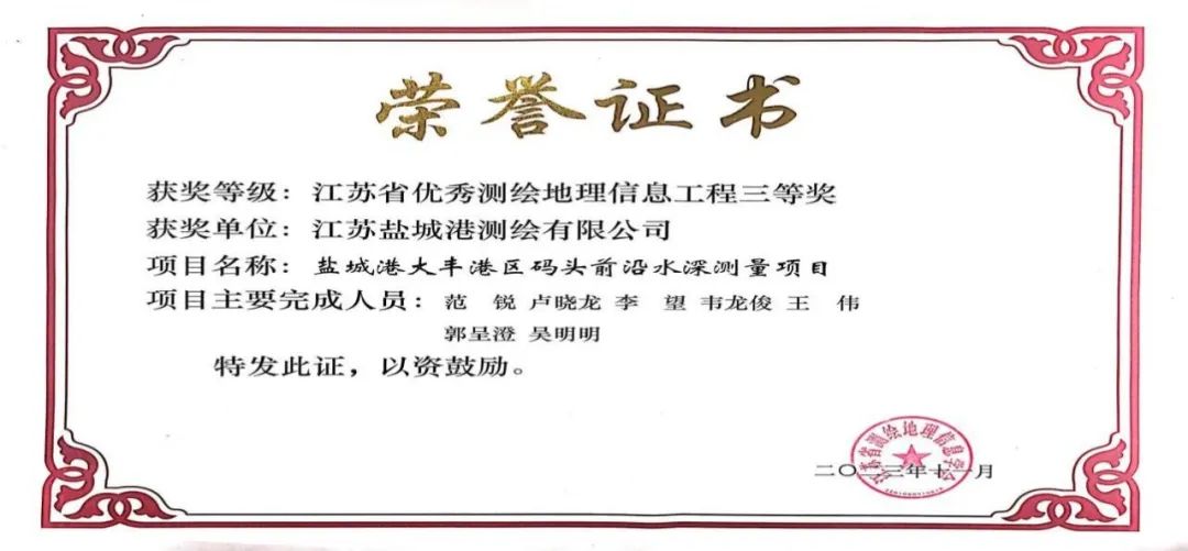近日,江苏省测绘地理信息学会公布2023年度江苏省优秀测绘地理信息工程获奖名单,盐城港大丰港区码头前沿水深测量项目荣评2023年度江苏省优秀测绘地理信息工程三等奖。