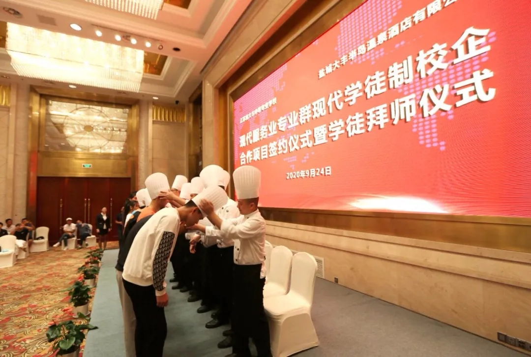 据悉,大丰中等专业学校和大丰港集团旗下半岛温泉酒店签订协议,双方将共同探索建立校企“联合招生、联合培养、定向就业”的人才培养长效机制,为创新人才培养方式提供了一个崭新平台。通过合作,学校和企业进行优势互补,实现资源共享。活动中,学校、酒店、家长、学生四方代表签订了现代学徒制工学交替跟岗实习协议,并举行首批学徒制拜师仪式,23名学生顺利拜师跟岗。