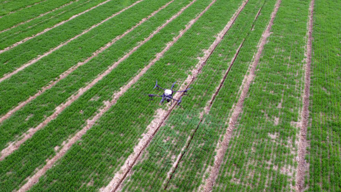 在田间的一头,华丰公司的植保无人机“飞手”正在进行“飞防”作业,确保了农田生产安全,相比传统人工打药防治,每亩地的劳动力、药品成本可降低45%。