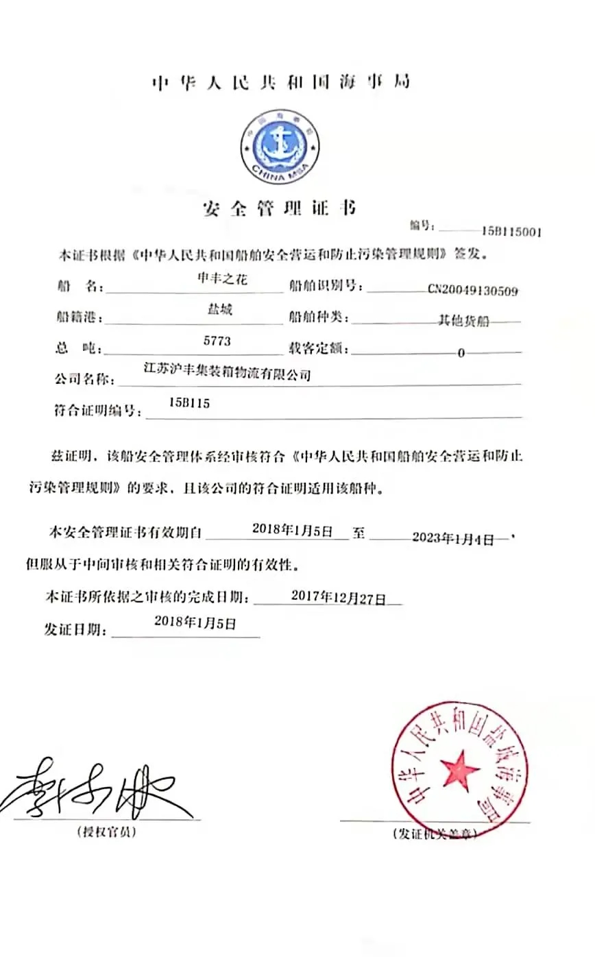 审核组根据NSM规则对沪丰公司安全管理体系进行了覆盖性审核,重点查看了体系文件修改情况、船舶各项安全与防治污染管理活动开展情况等。审核组综合判定沪丰公司安全管理体系文件的覆盖面、适用性符合实际,岸基对船舶的保障支持可靠及时,体系运行良好,一致同意江苏沪丰集装箱物流有限公司通过安全管理体系年度审核,给予公司DOC证书年度签注。
